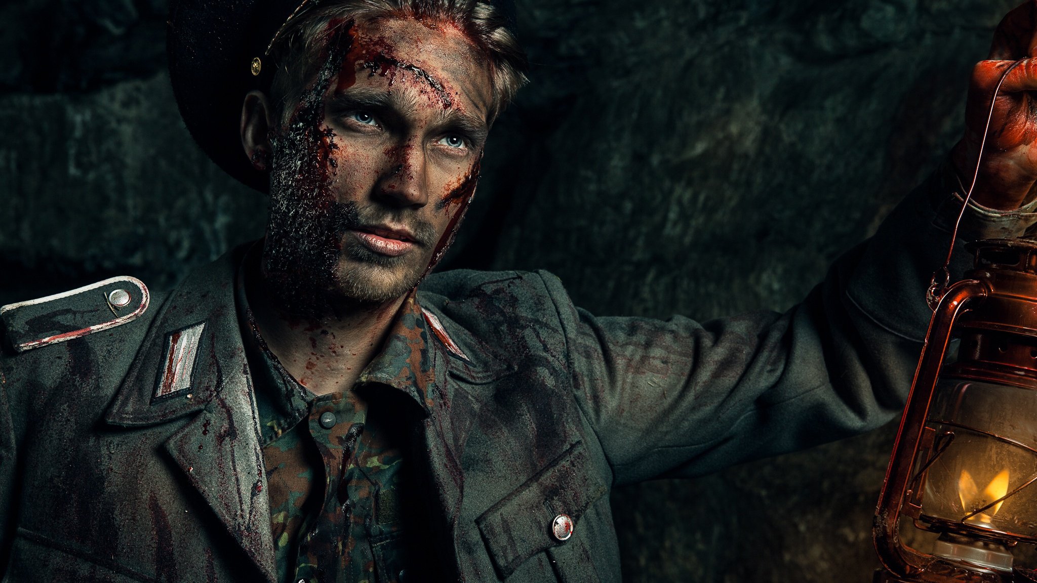 Soldado herido en uniforme sostiene una lámpara - fondos de pantalla
