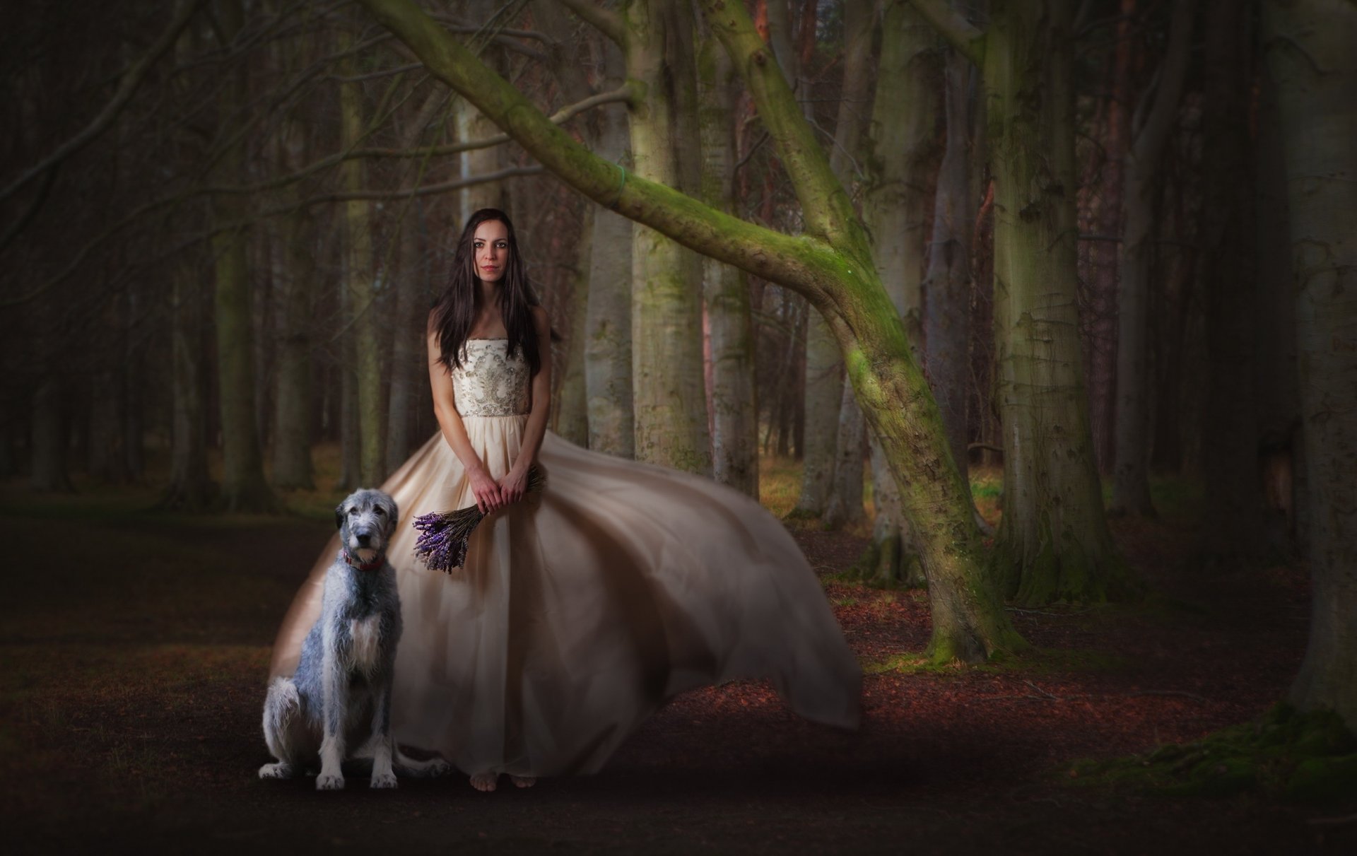 Etiquetas:chica, vestido, ramo, perro, bosque, esperando