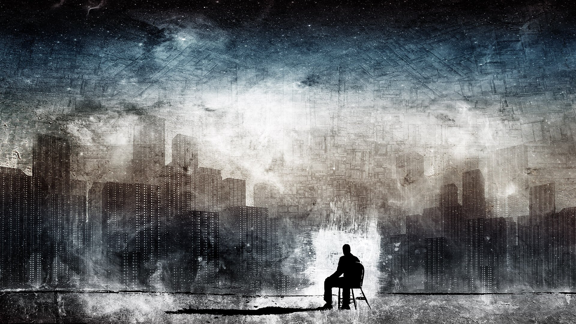 El hombre en una silla en el fondo de la ciudad - fondos de Escritorio