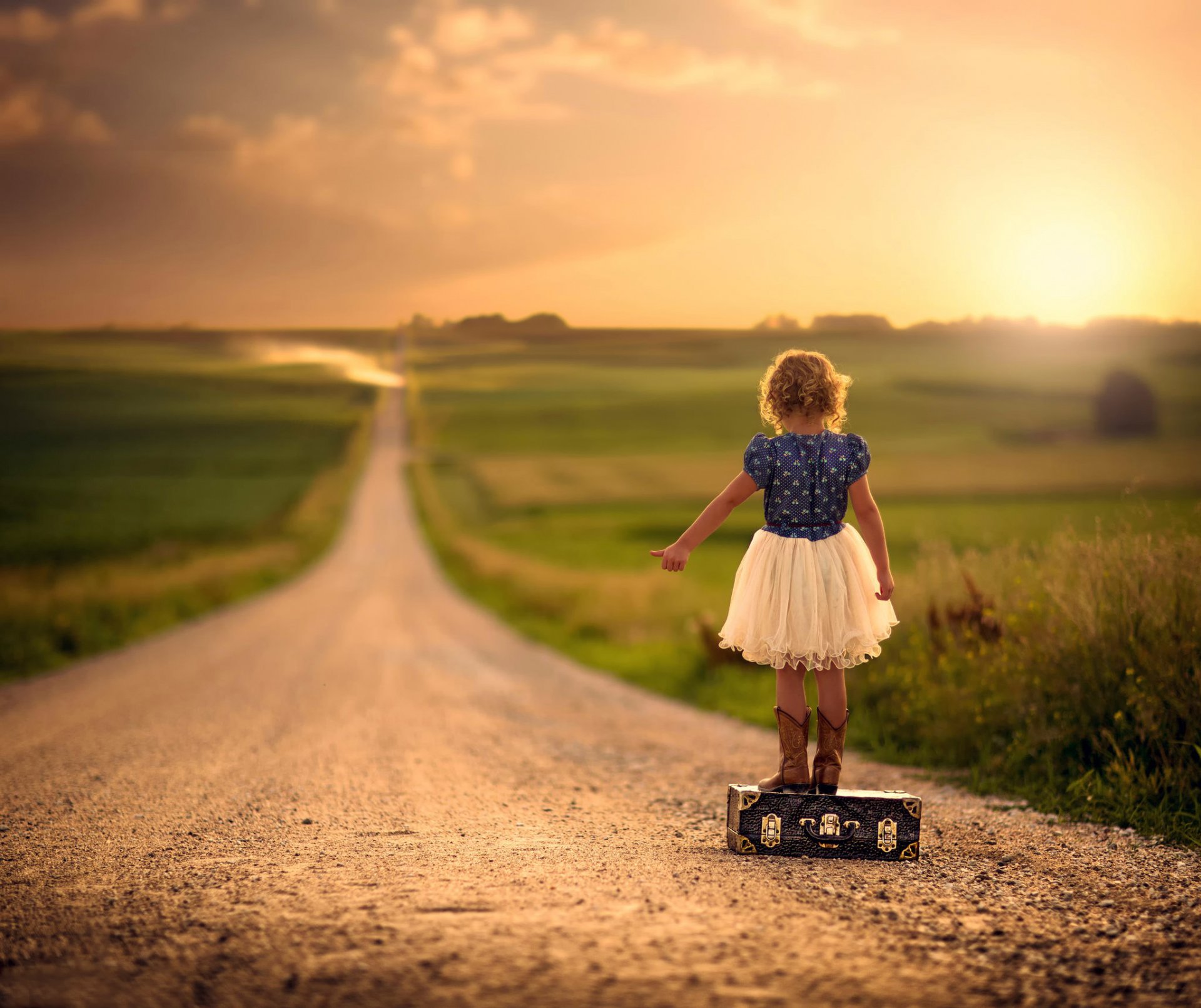 Niña de pie en una maleta en la carretera - fondos de Escritorio