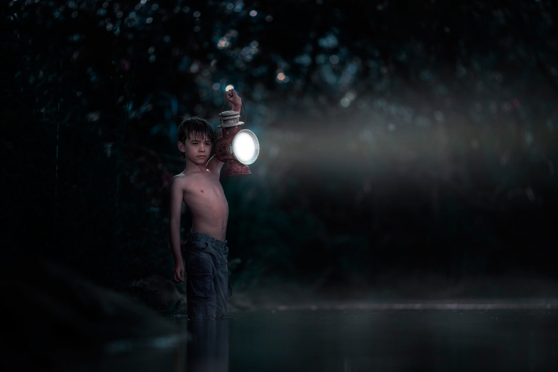 Un niño en la oscuridad con una linterna en la mano - fondos de Escritorio