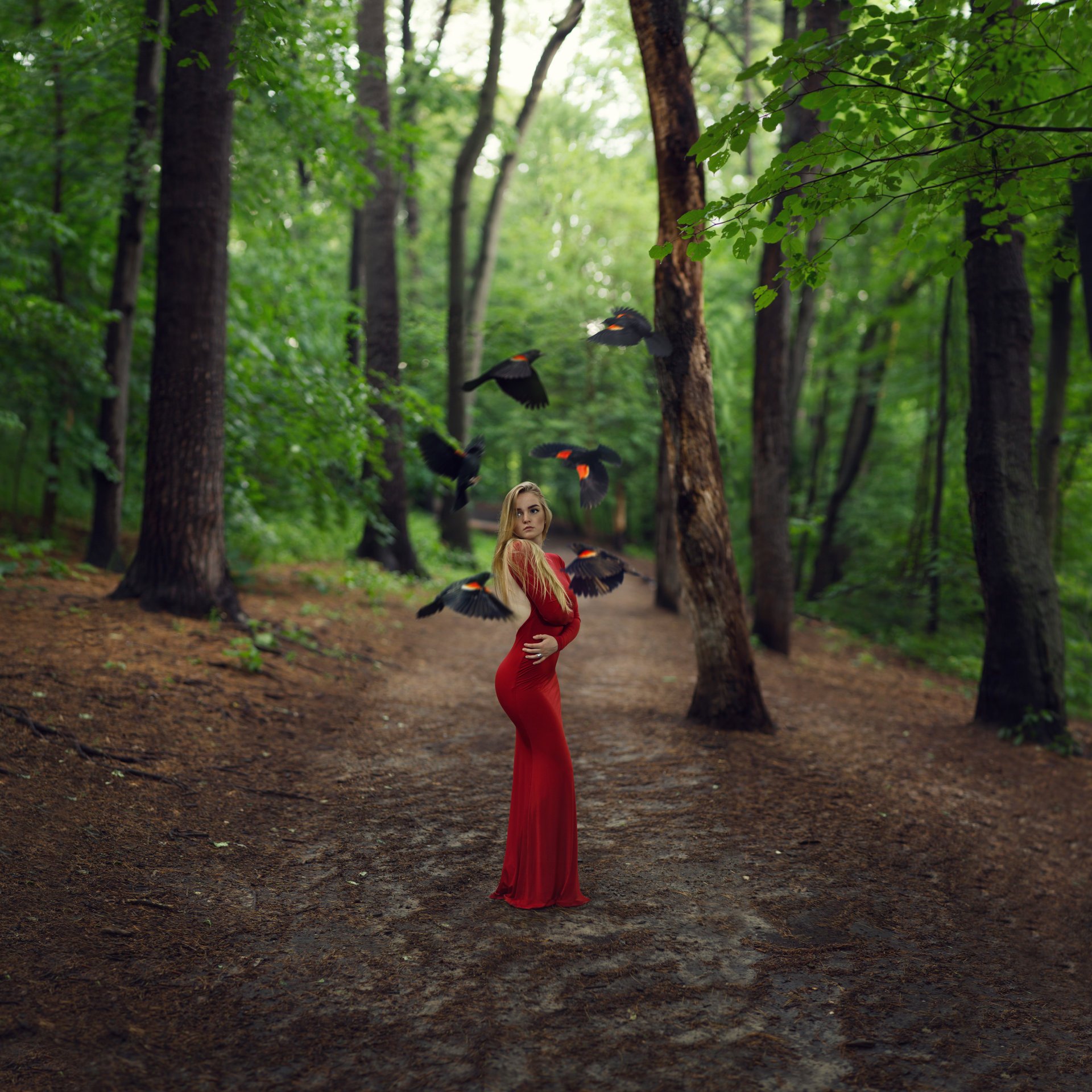 Etiquetas:primavera, chica, en rojo, vestido, figura, pájaros, árboles