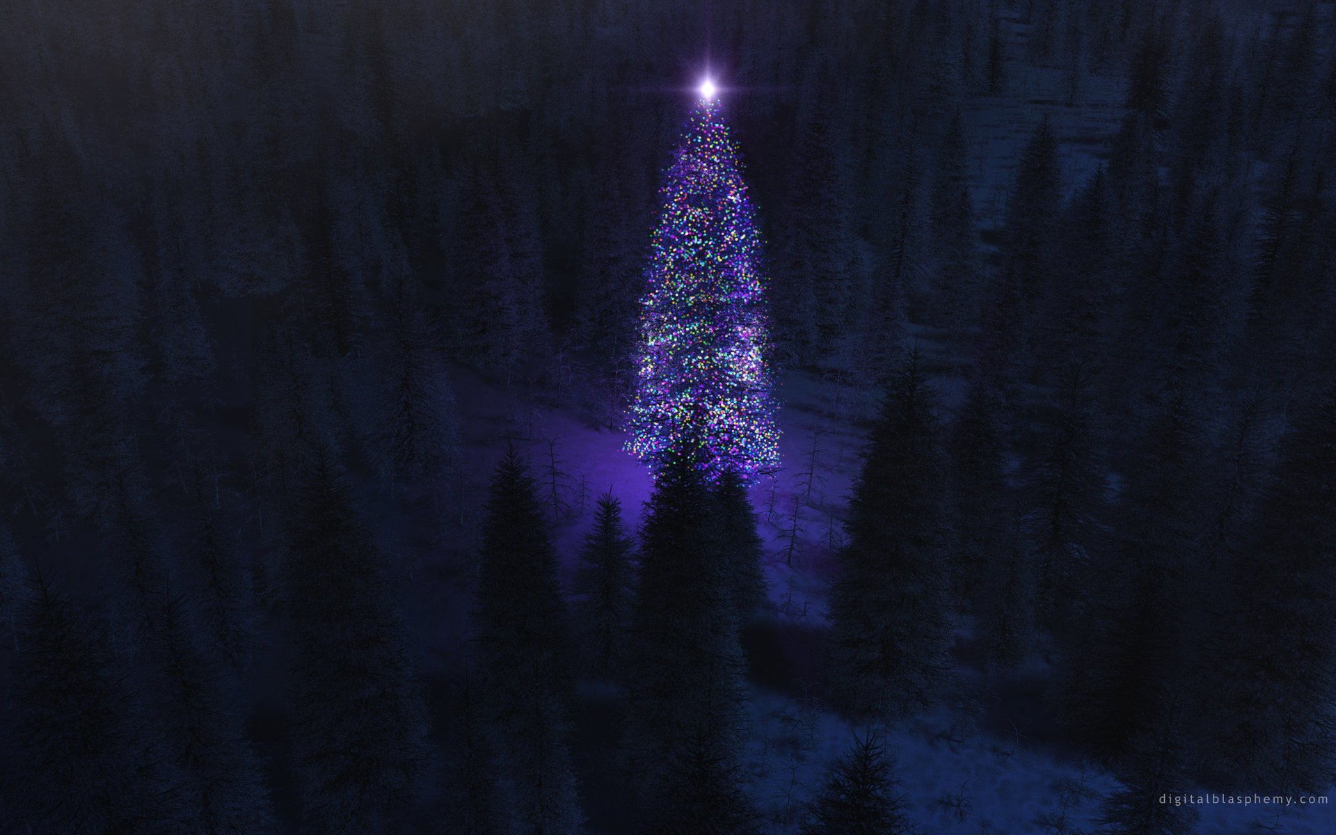 Árbol de Navidad con luces en la noche en el bosque oscuro