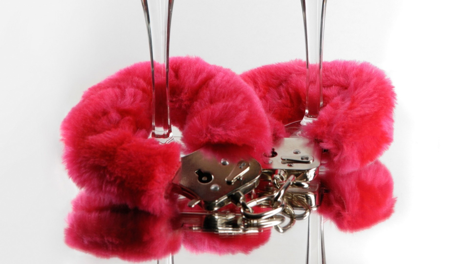 Las esposas de piel roja se sujetan a las patas de las copas de vino sobre un fondo blancoLas esposas de piel roja se sujetan a las patas de las copas de vino sobre un fondo blanco