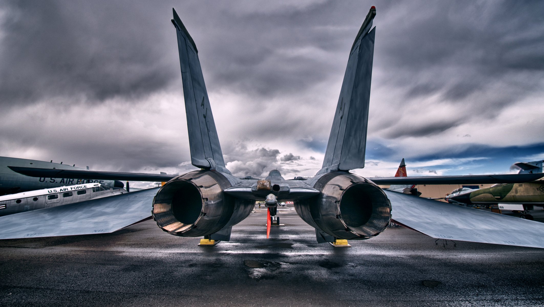 Gran caza vista trasera de la turbina y alas al aire libreGran caza vista trasera de la turbina y alas al aire libre