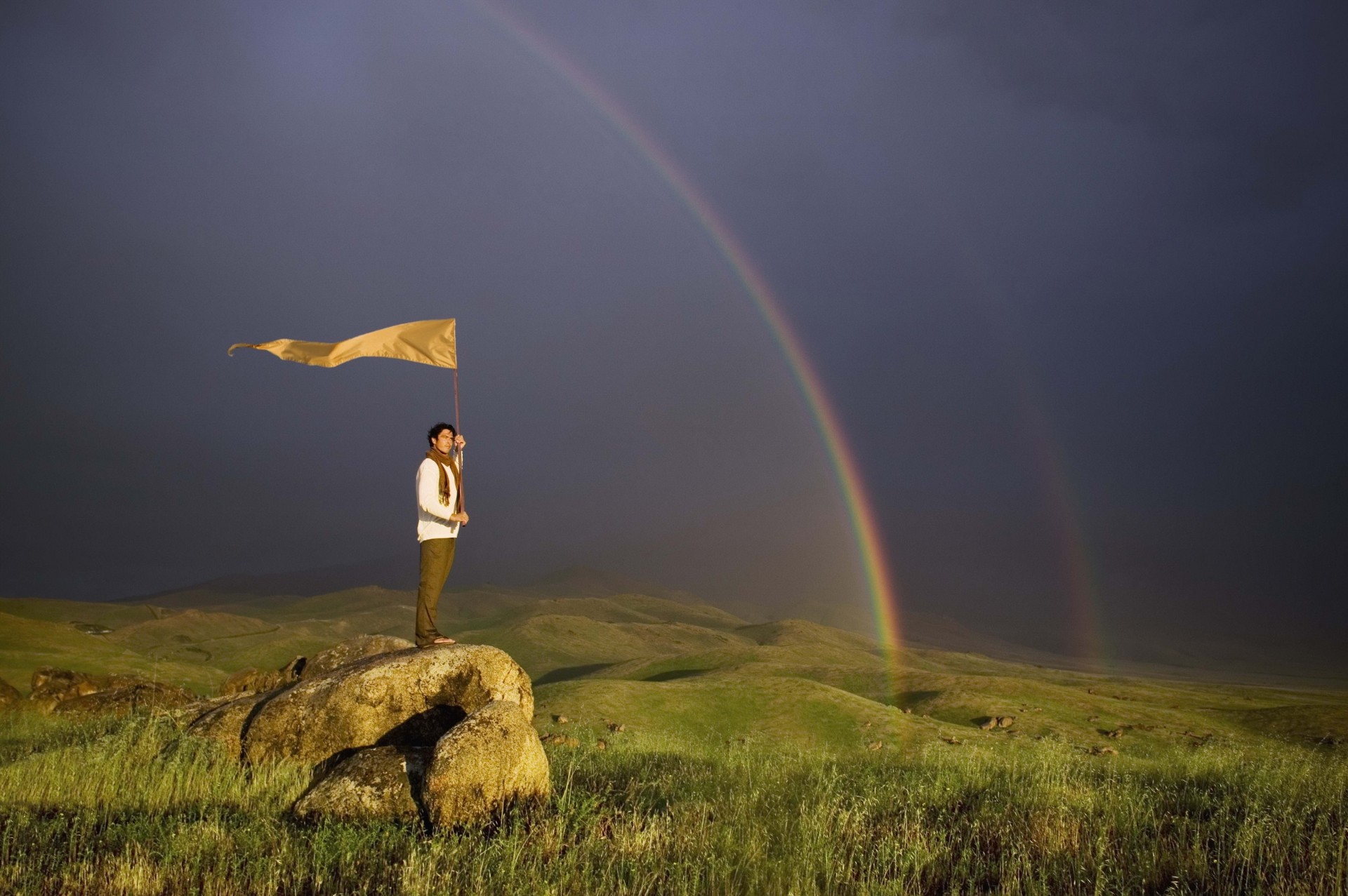 Hombre con bandera en piedra