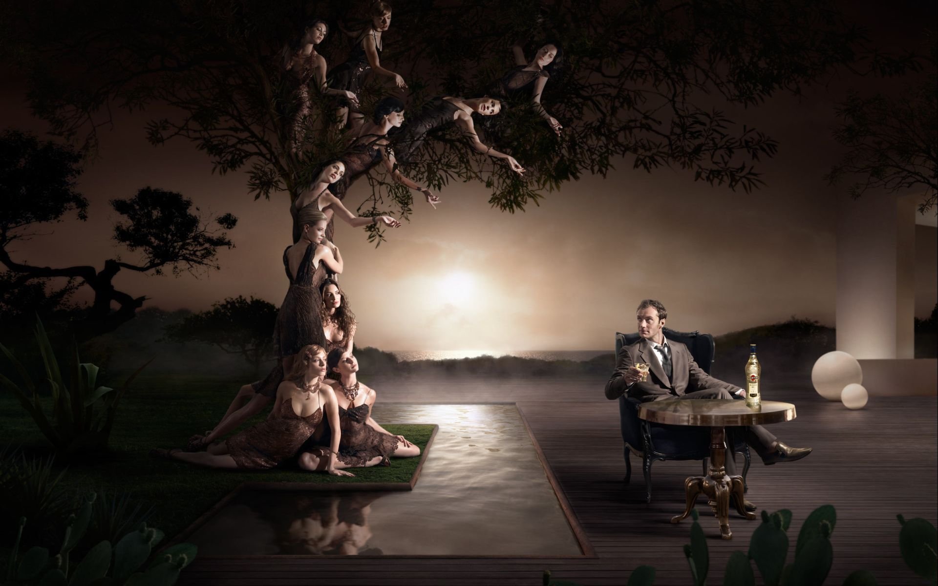 Un hombre de arte se sienta en una mesa y mira a las mujeres en un árbolUn hombre de arte se sienta en una mesa y Mira a las mujeres en un árbol