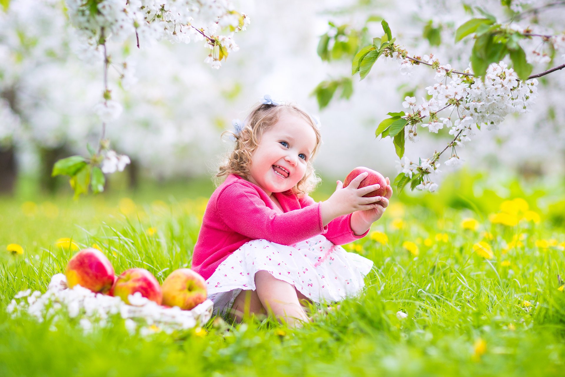 Un niño alegre con una manzana en sus manos se sienta en la hierbaUn niño alegre con una manzana en sus manos se sienta en la hierba