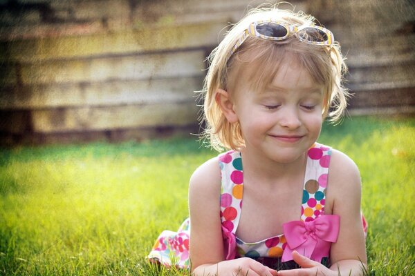 Chica alegre yace en la hierba verde