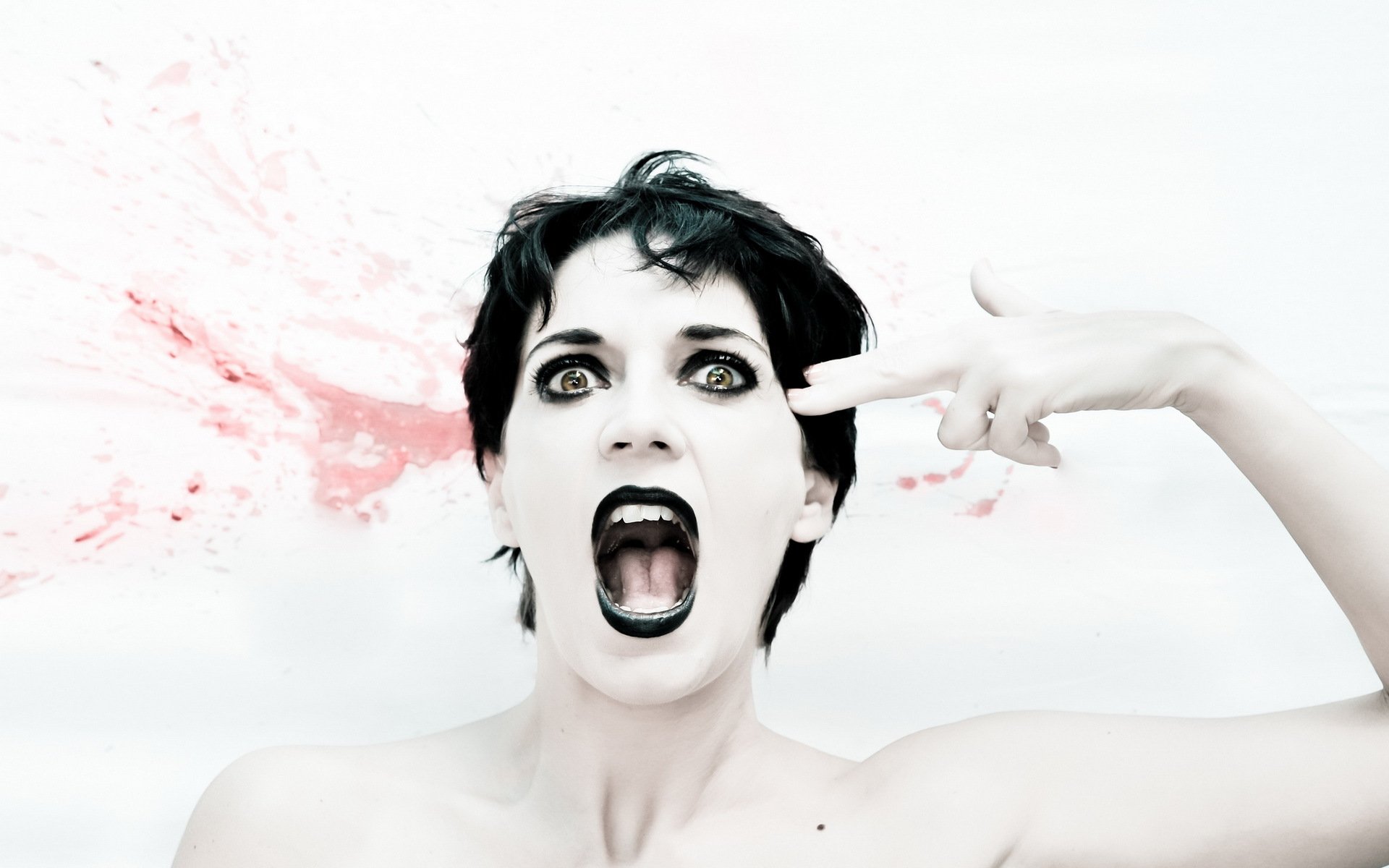 Chica pálida con lápiz labial negro imita un tiro de dedoChica pálida con lápiz labial negro imita un tiro de dedo