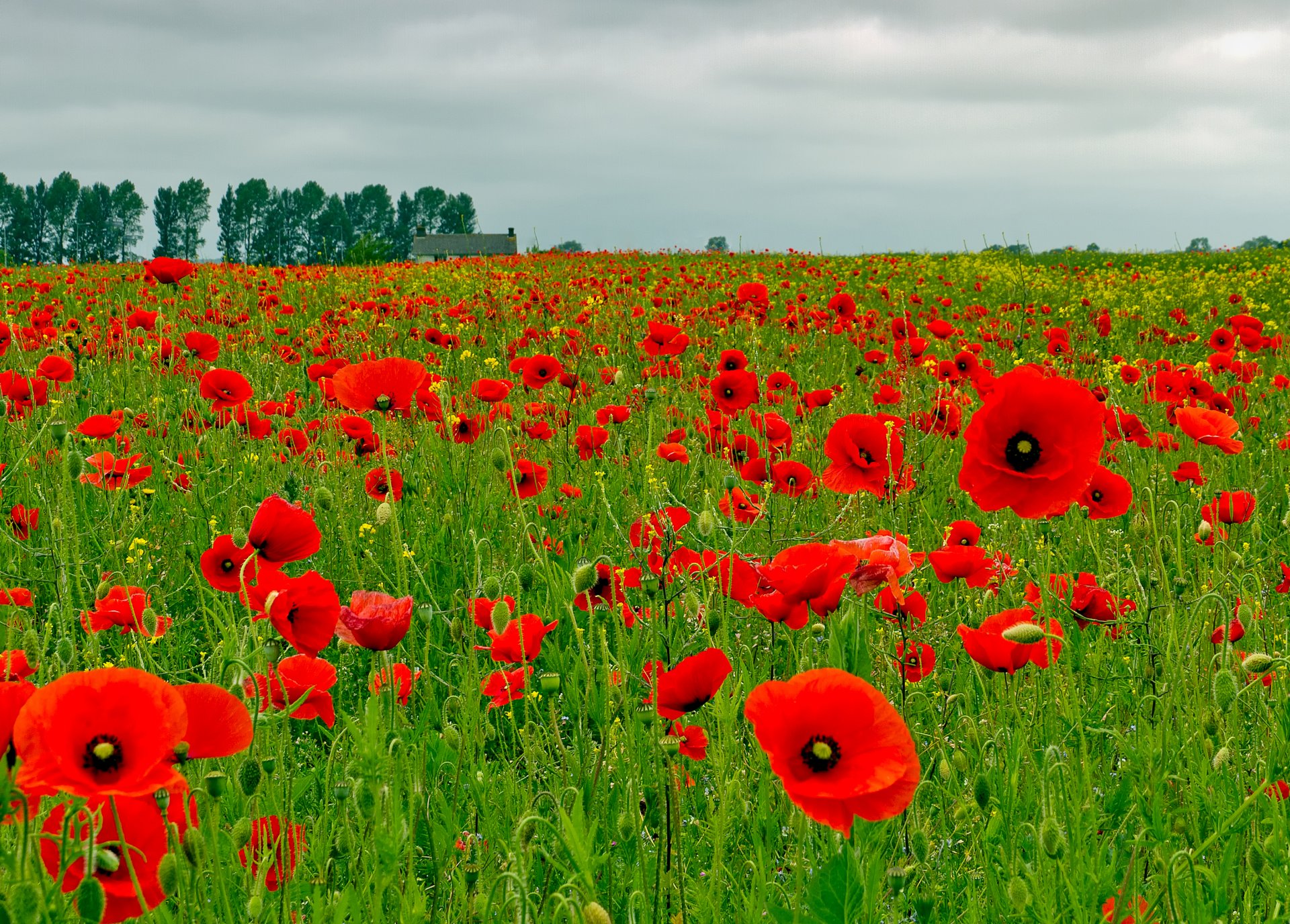 Un campo de amapolas rojas contra la niebla