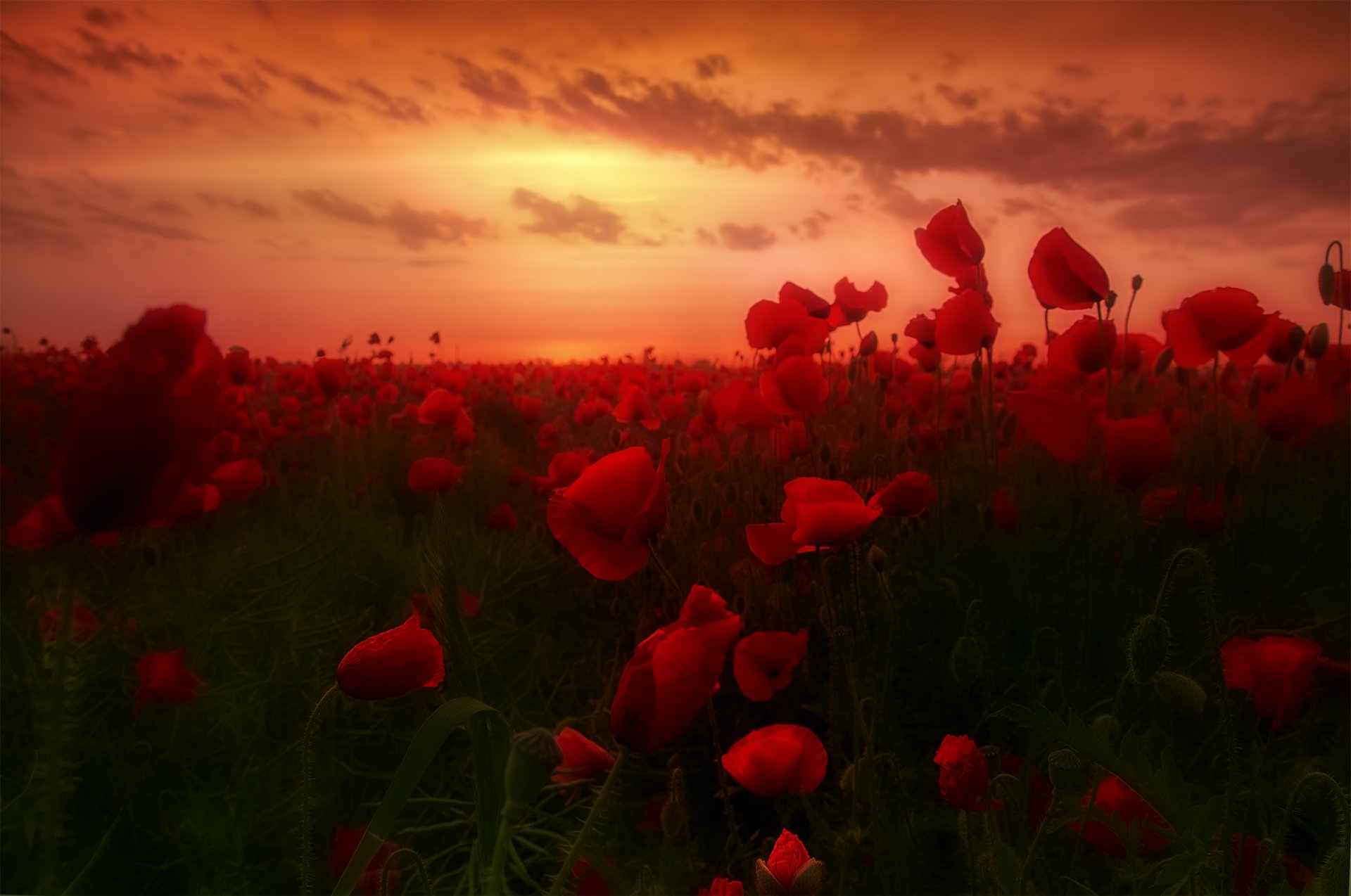 Brotes abiertos de tulipanes rojos sobre un fondo verde