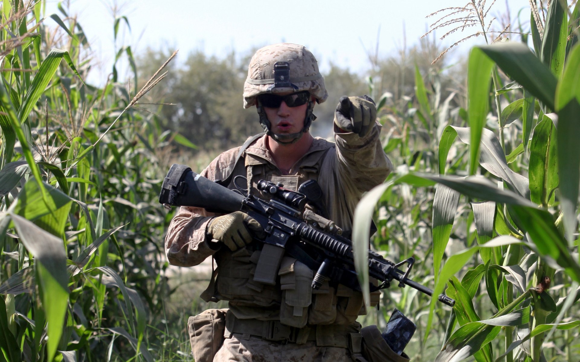 Soldado con rifle de asalto en casco y gafas balísticasSoldado con rifle de asalto en casco y gafas balísticas