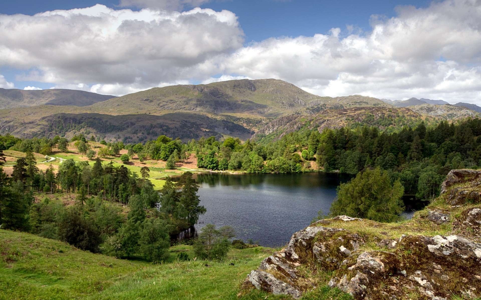 Paisaje del bosque en el fondo del lago y la montañaPaisaje del bosque en el fondo del lago y la montaña