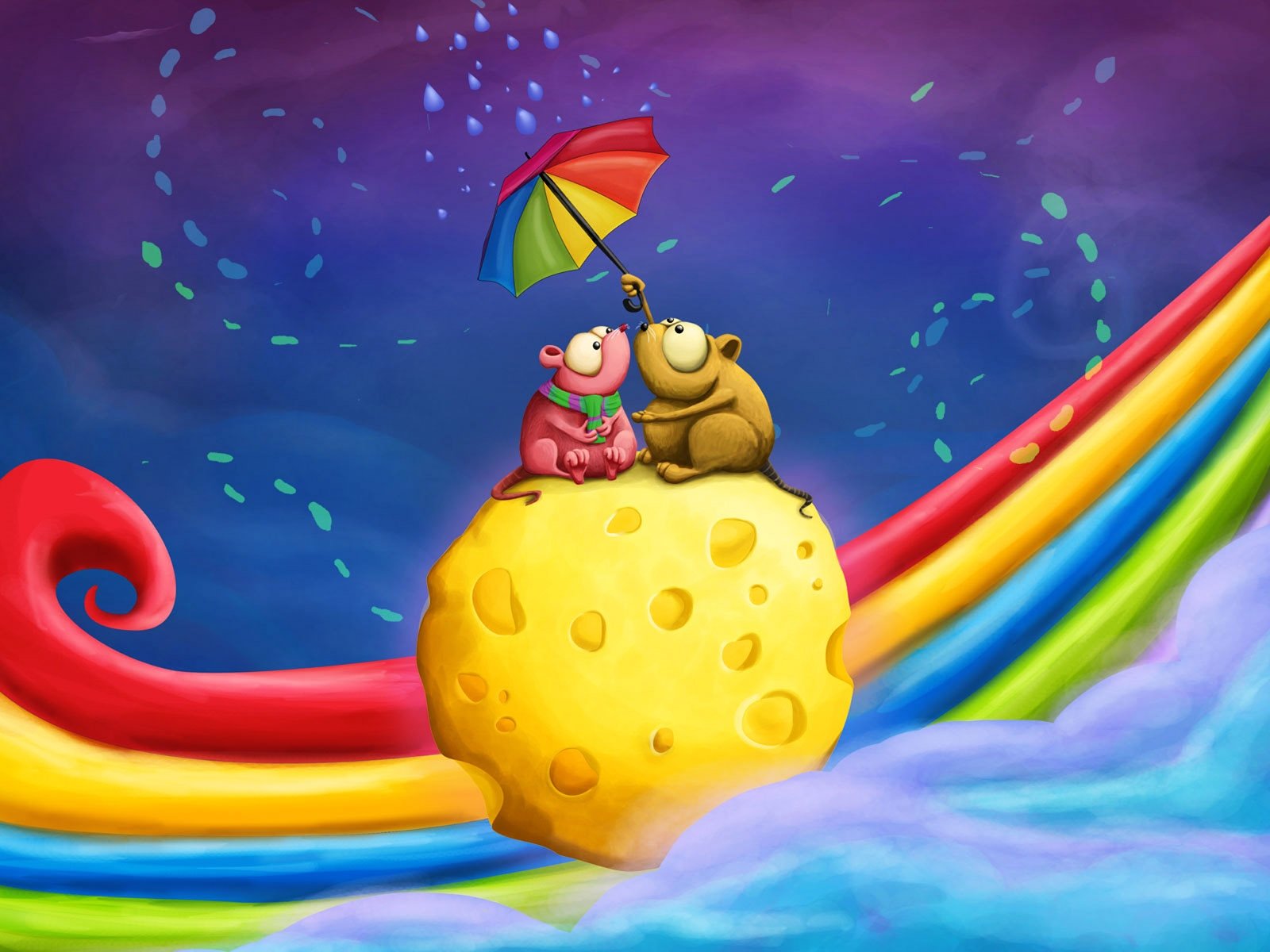 Dos ratones bajo el paraguas del arco iris en una bola de quesoDos ratones bajo el paraguas del arco iris en una bola de queso