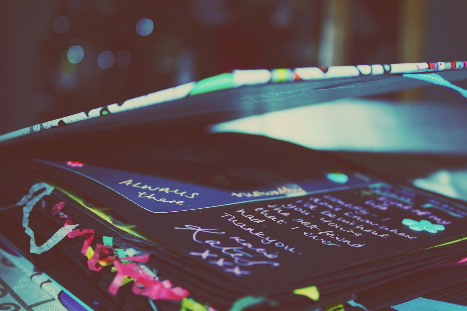 Texto escrito con hermosa letra en las páginas negras del diarioTexto escrito con hermosa letra en las páginas negras del diario
