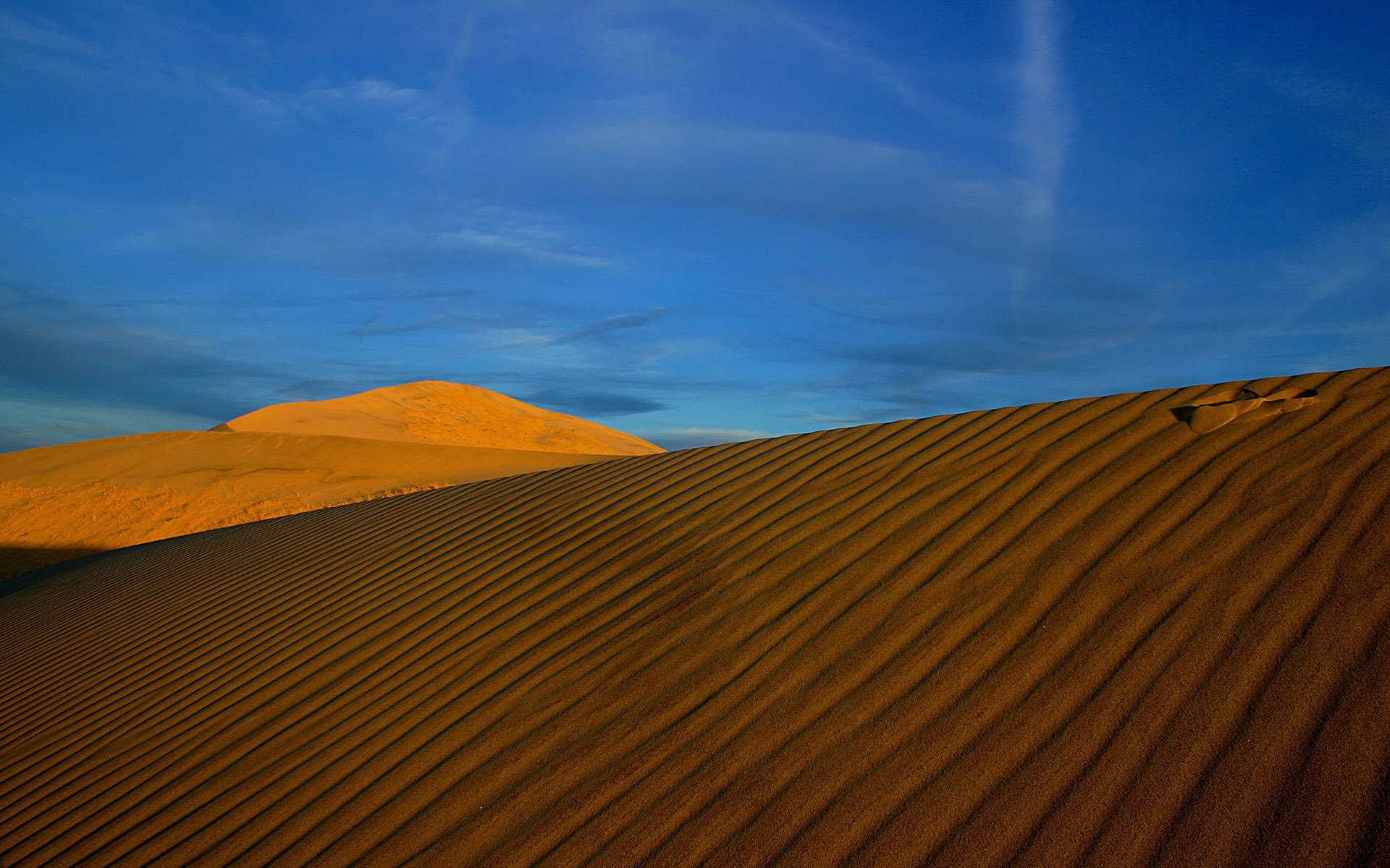 Paisaje desértico. arenas y montañas en el horizonte. el hombre camina por el desiertoPaisaje desértico. Arenas y montañas en el horizonte. El hombre camina por el desierto