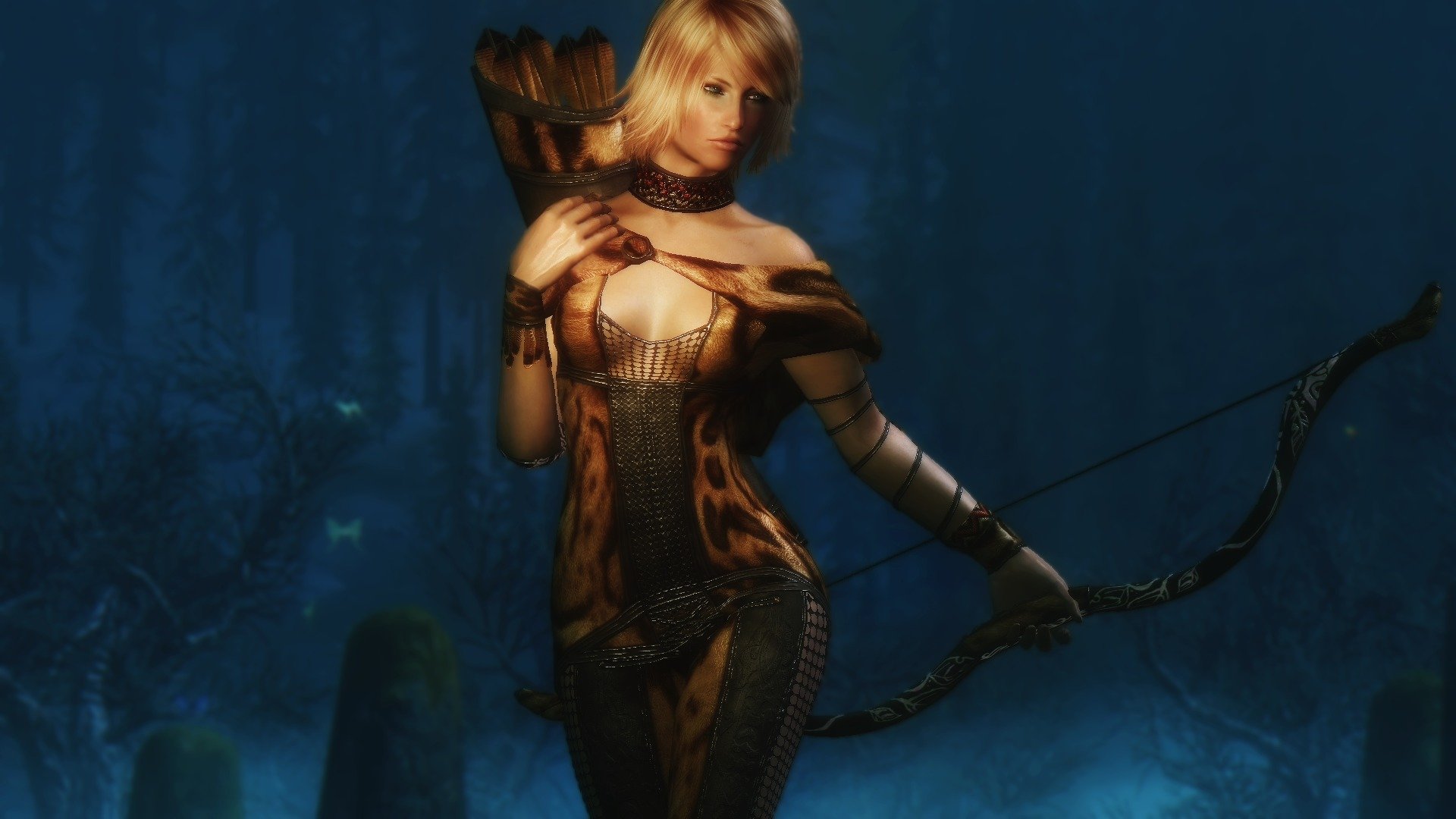 Chica con un arco en el fondo de la montaña de la nocheChica con un arco en el fondo de la montaña de la noche