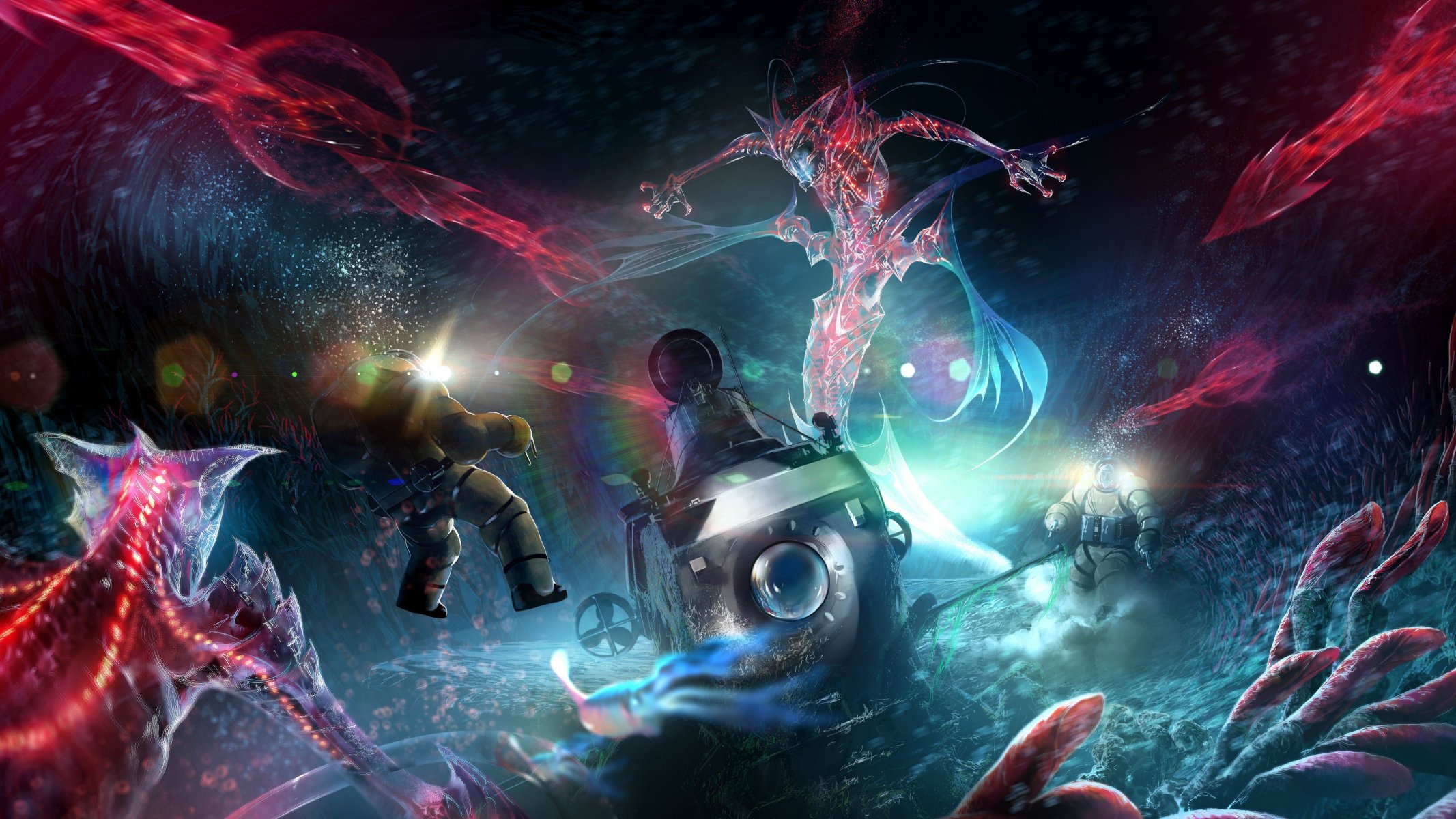 Mundo submarino con sirenas sosteniendo una lanza en la mano, rodeado de monstruos