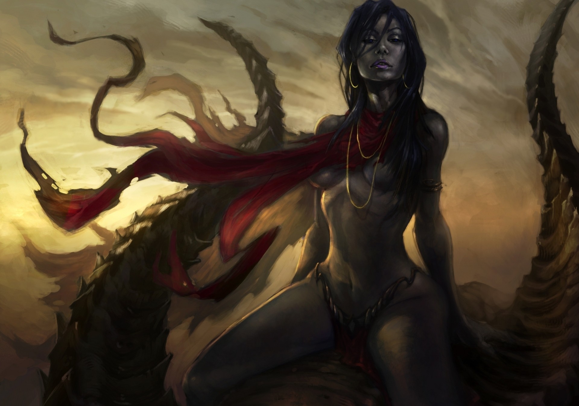 Arte del arte, chica en posición sentada, en el cuello de la joyería yveter desarrolla una bufanda sangrienta, despierta fantasíasArte del arte, chica en posición sentada, en el cuello de la joyería yveter desarrolla una bufanda sangrienta, despierta fantasías