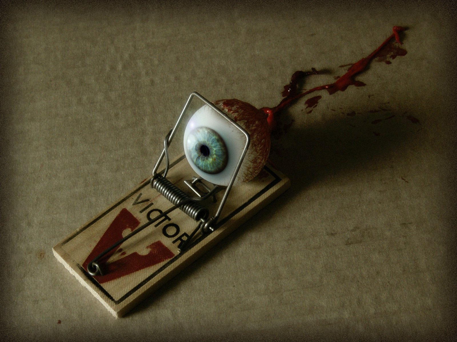 Ratón de ordenador azul que quedó atrapado en una trampa para ratones