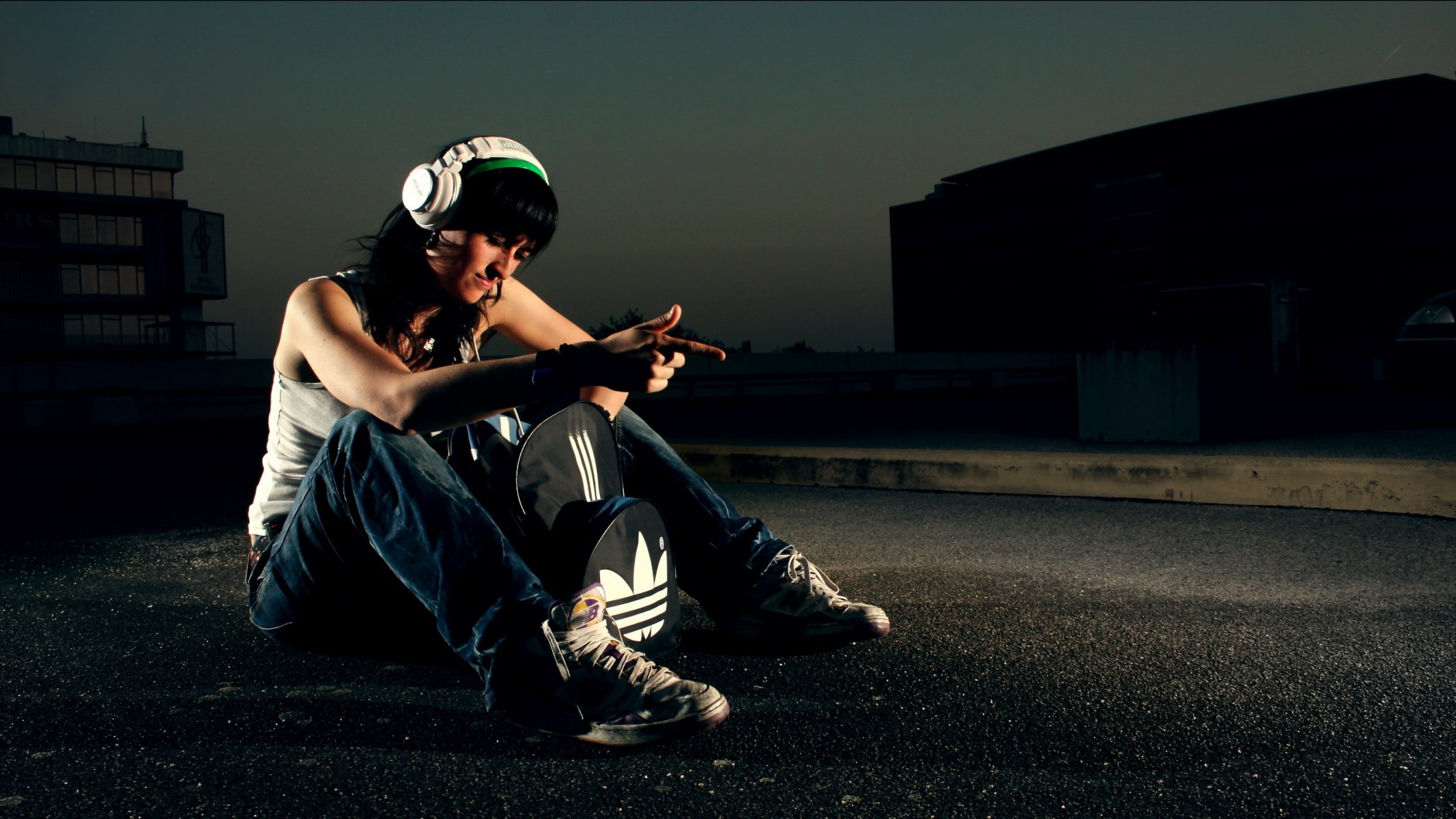 Una chica con auriculares y una bolsa se sienta en el techoUna chica con auriculares y una bolsa se sienta en el techo