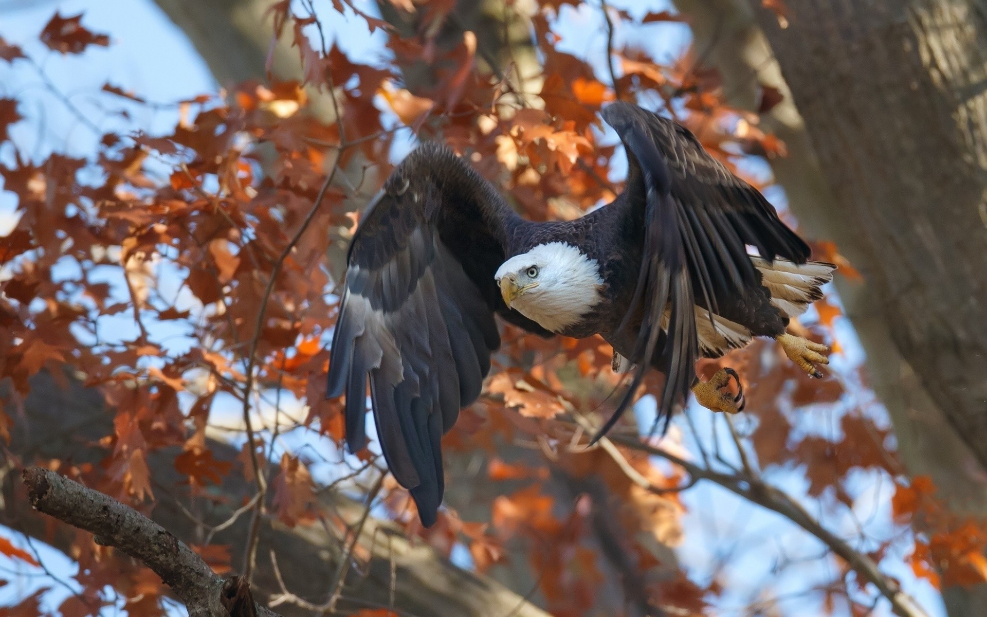 Ave de rapiña águila-cola vuela hacia el agua en busca de presas