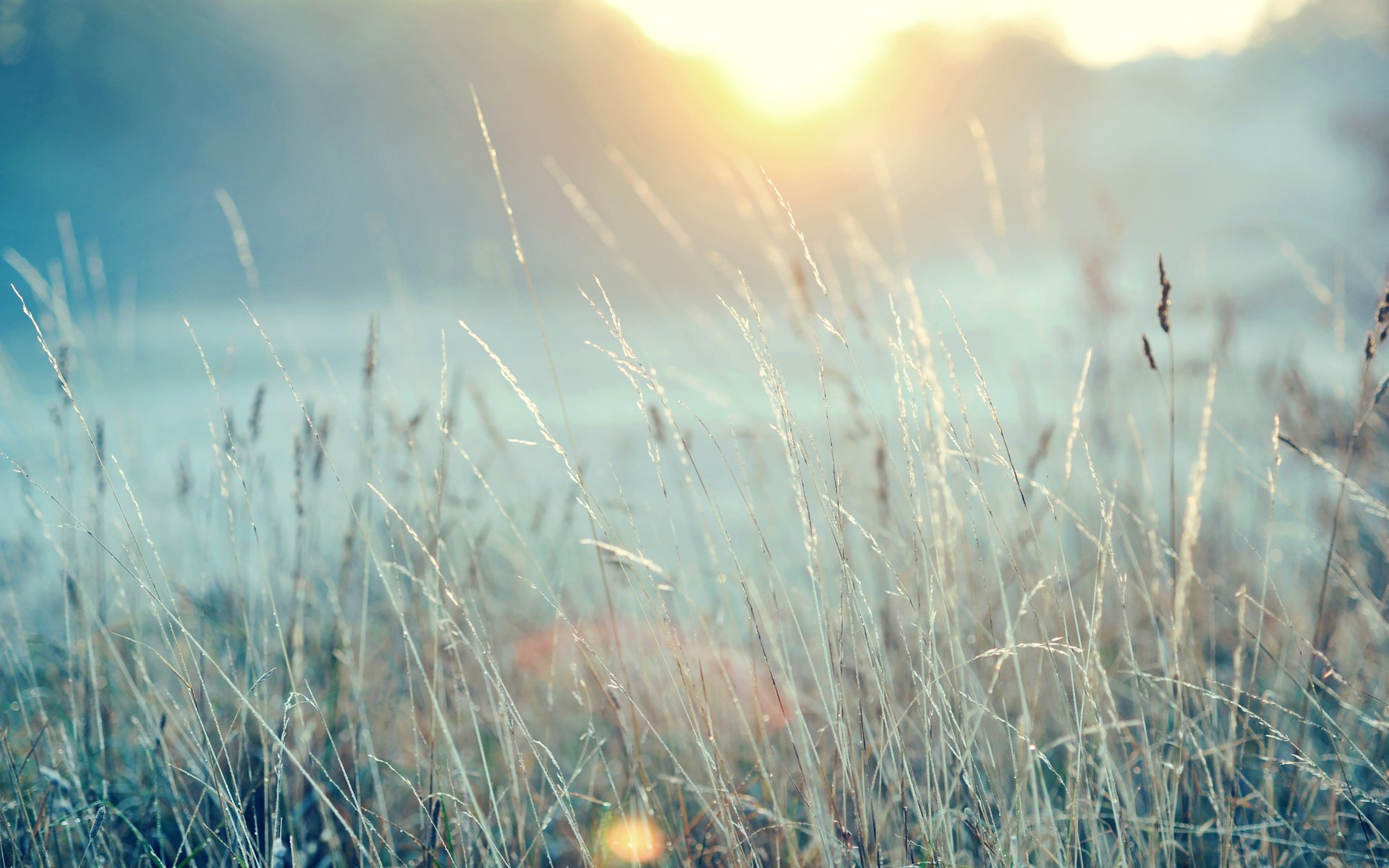 Hojas de hierba en el campo en el fondo de la puesta del sol