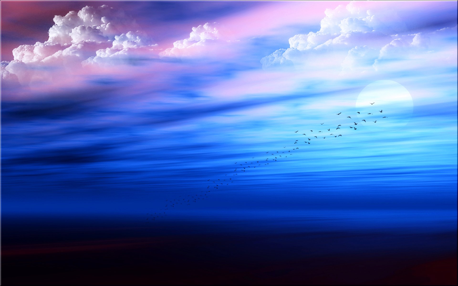 Atardecer. un árbol de ciervos y una bandada de aves se reflejan en el aguaAtardecer. Un árbol de ciervos y una bandada de aves se reflejan en el agua