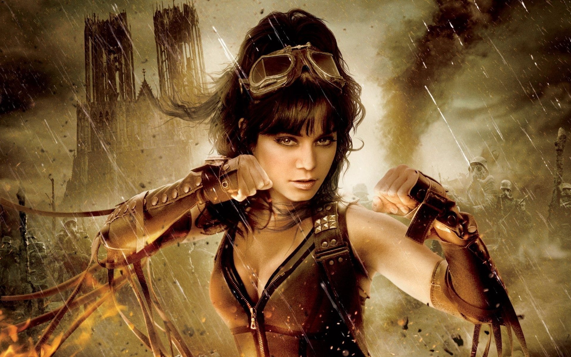 Decidida chica super héroe en capa negra en el fondo de la lucha, explosiones, aviones voladoresDecidida chica super héroe en capa negra en el fondo de la lucha, explosiones, aviones voladores