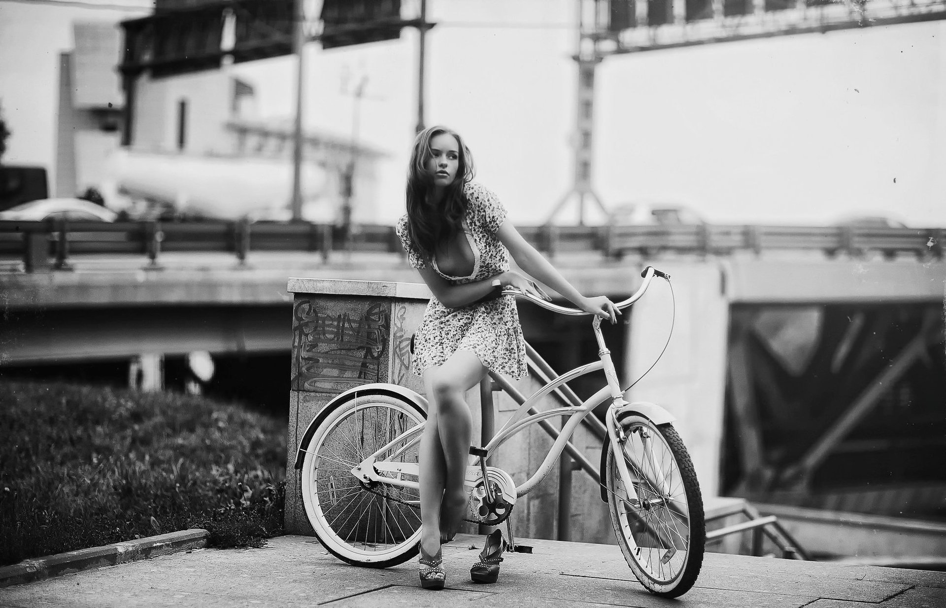 Chica con una hermosa figura en una bicicleta foto en blanco y negroChica con una hermosa figura en una bicicleta foto en blanco y negro