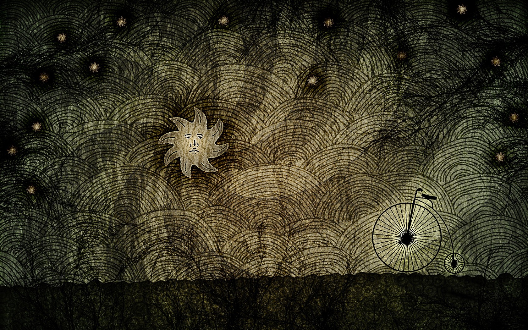 Pintura con cielo estrellado, bicicleta y luna tristePintura con cielo estrellado, bicicleta y Luna triste