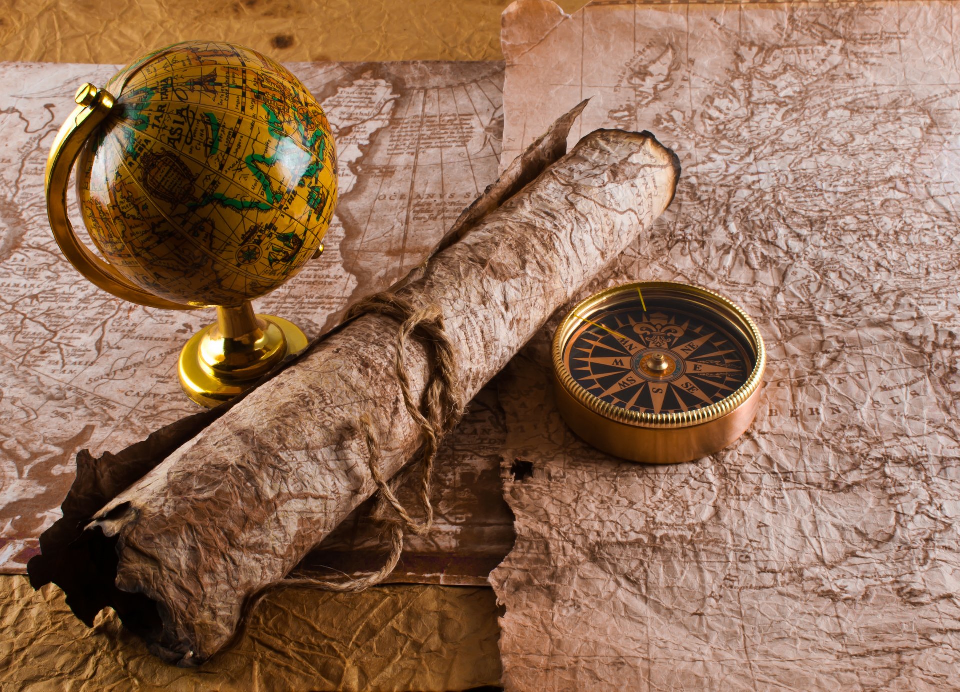 Un viejo manuscrito enrollado por un rollo yace junto a una brújula