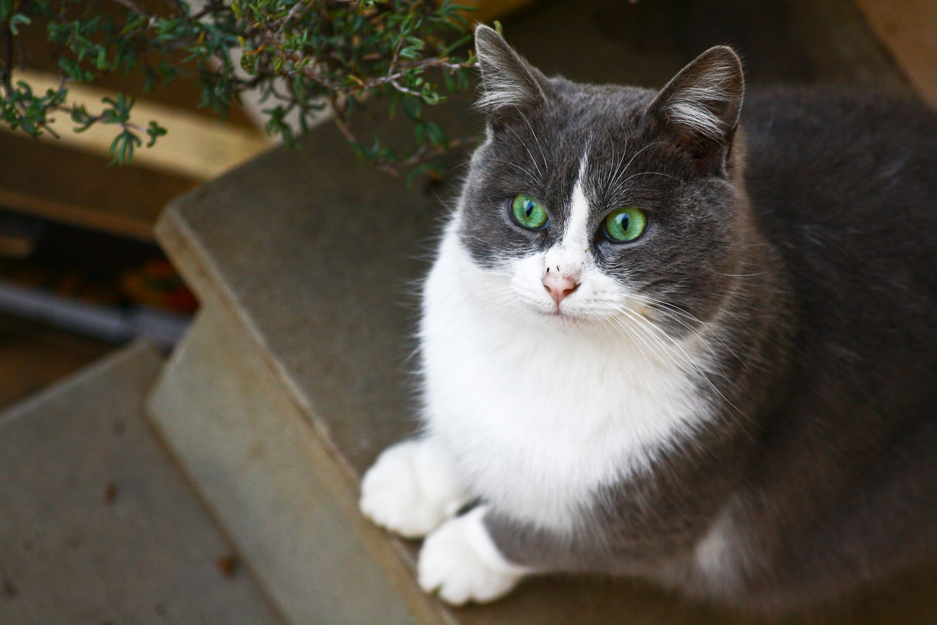 Gato gris blanco con ojos verdes