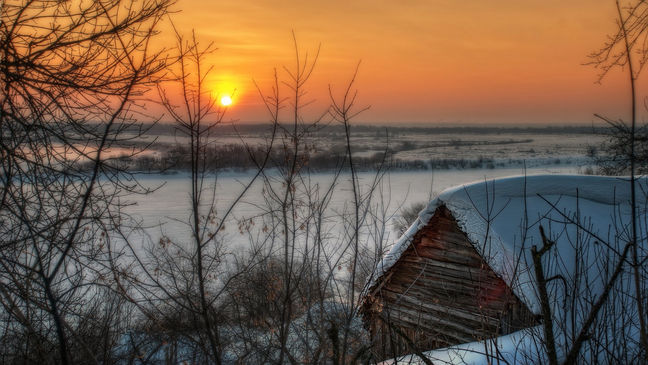 Puesta de sol sobre el bosque de invierno y la cabañaPuesta de sol sobre el bosque de invierno y la cabaña