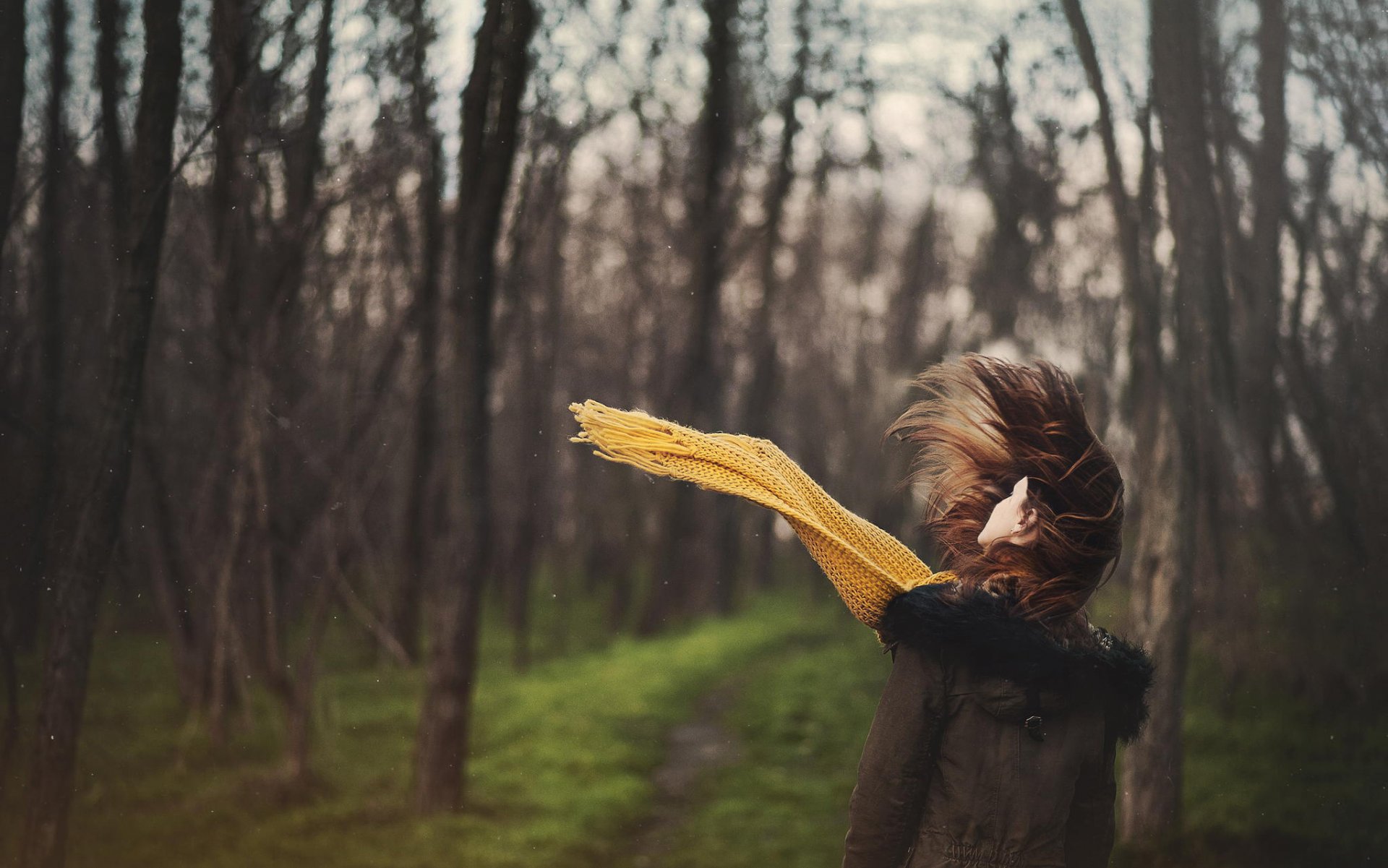 Chica de pelo oscuro en ropa amarilla con bufanda alrededor del cuelloChica de pelo oscuro en ropa amarilla con bufanda alrededor del cuello
