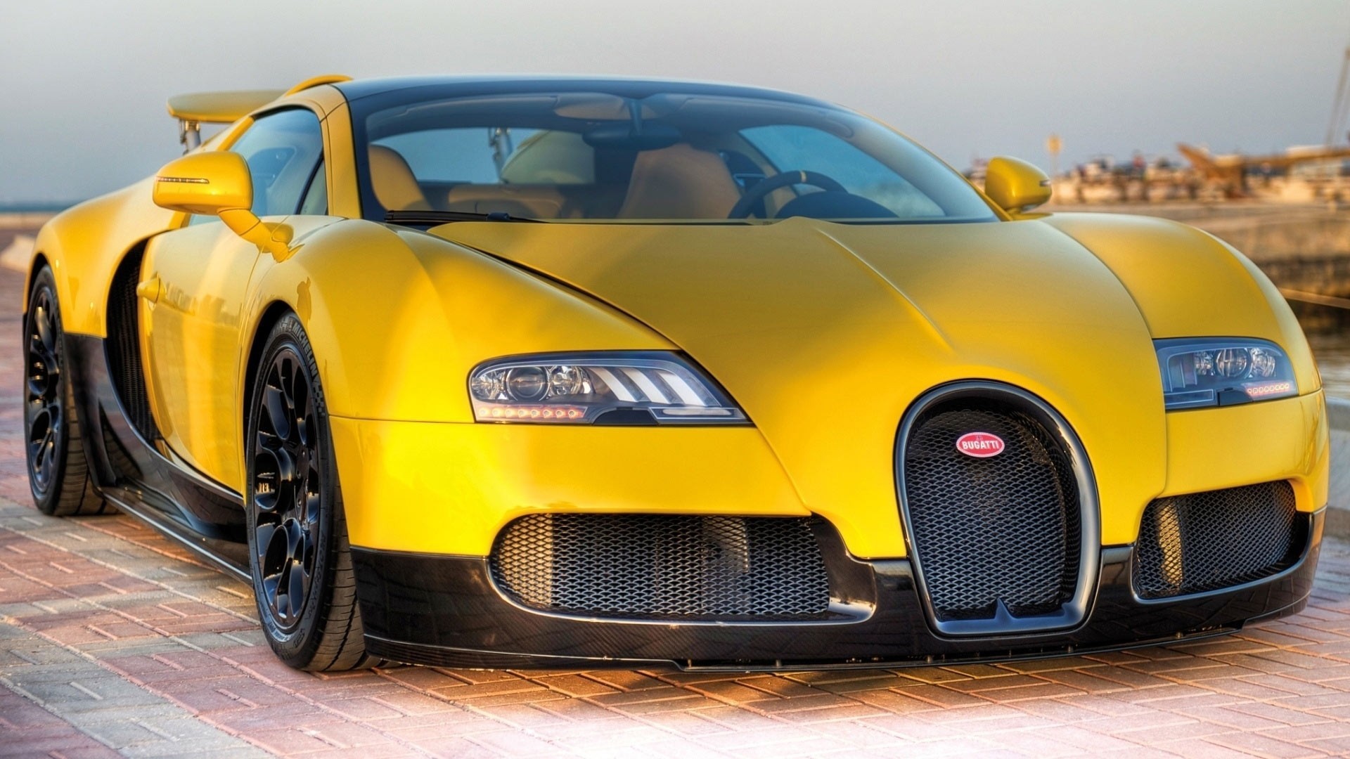 Cerca del océano con palmeras se encuentra un coche naranjaCerca del océano con palmeras se encuentra un coche naranja