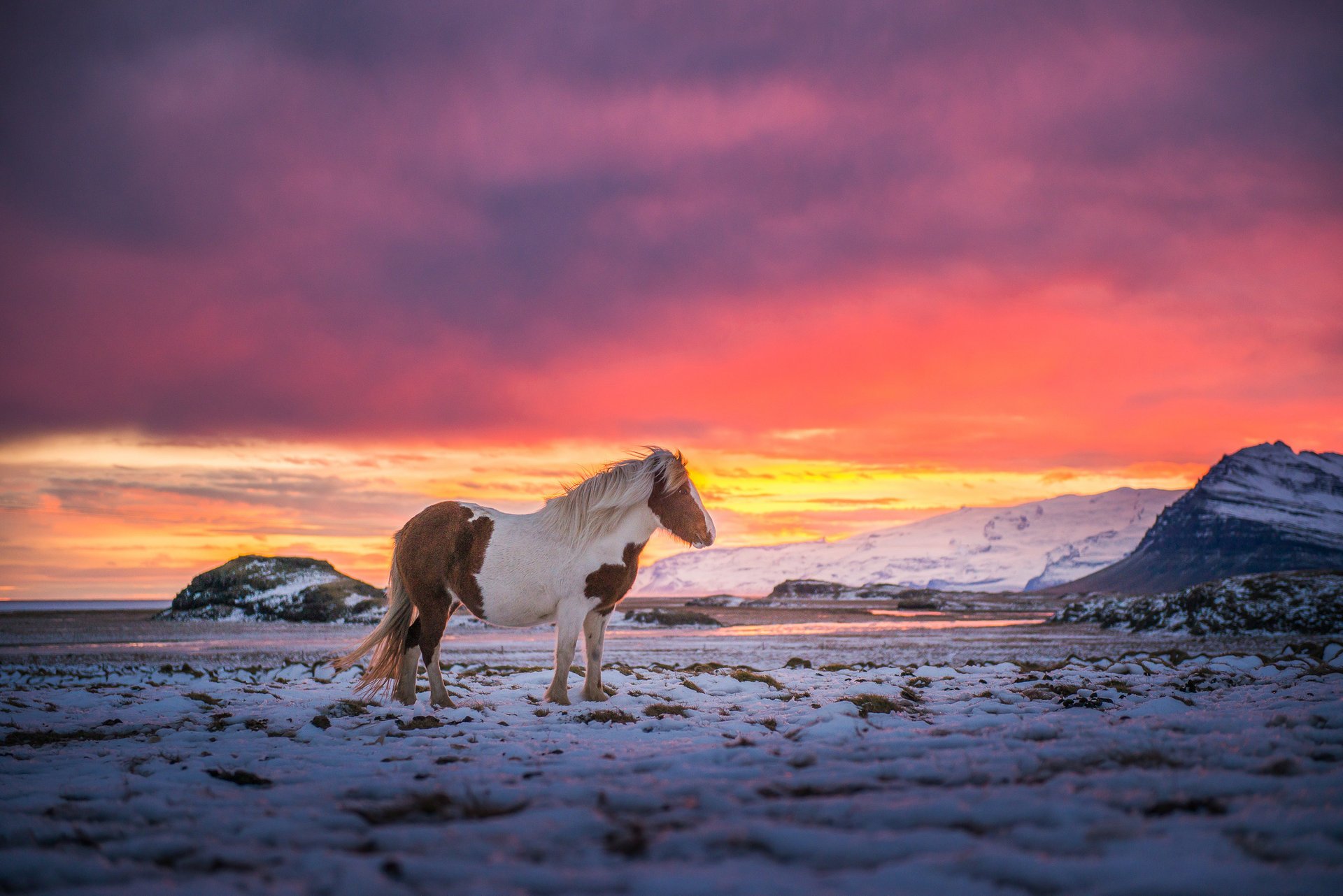 En el fondo del cielo al atardecer, un caballo en las montañasEn el fondo del cielo al atardecer, un caballo en las montañas