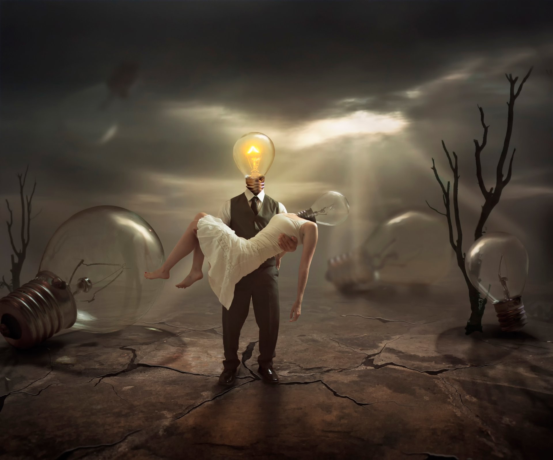 Una chica con la cabeza de un árbol y una bombilla en una rama y un cuervo negro en la hierba verdeUna chica con la cabeza de un árbol y una bombilla en una rama y un Cuervo negro en la hierba verde