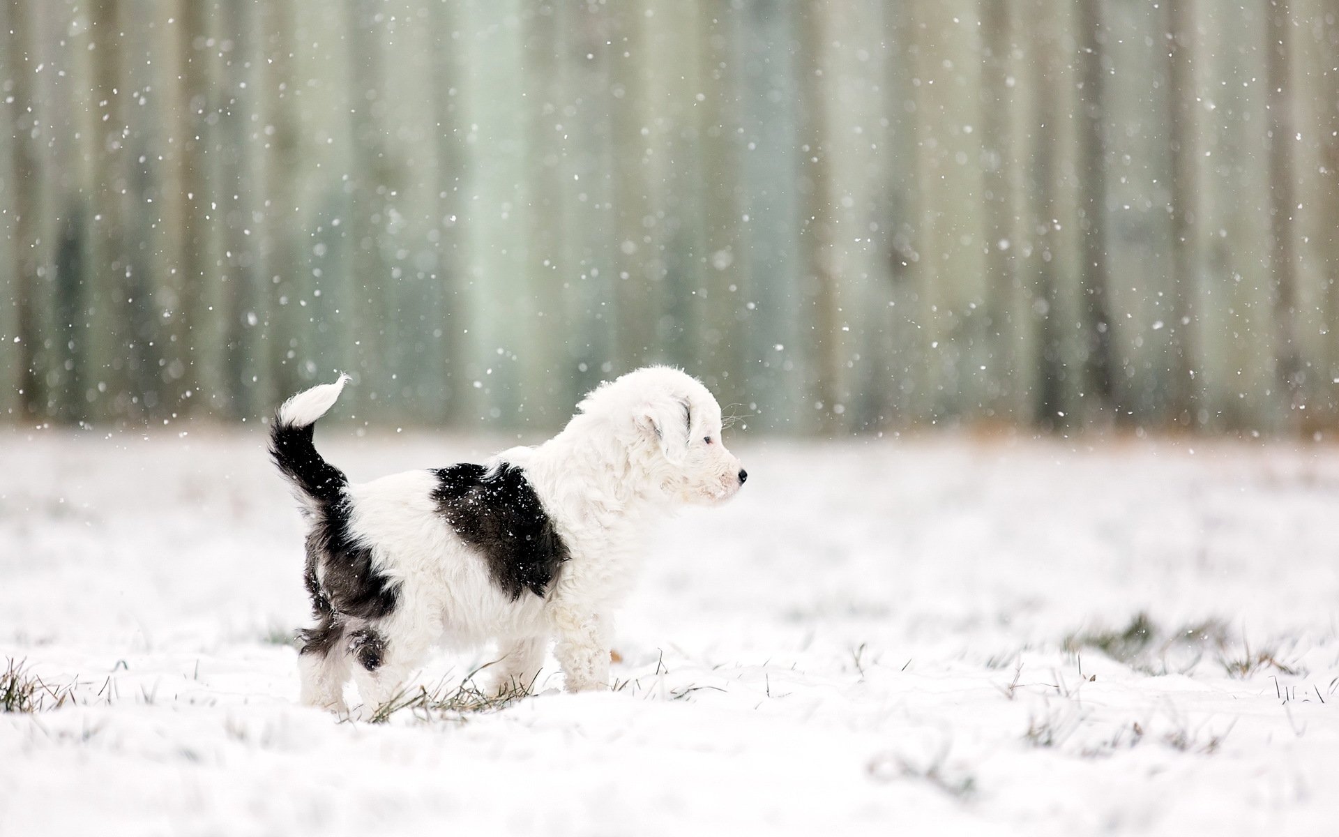 Pequeño cachorro blanco y negro de lado