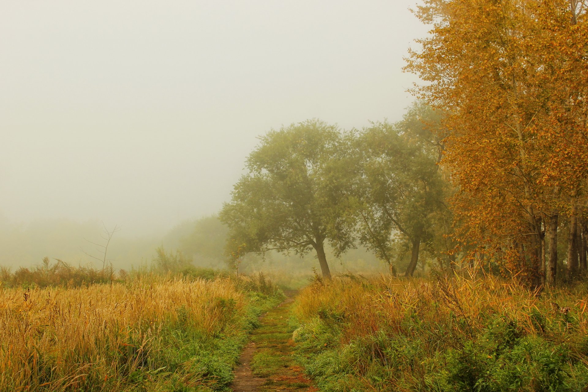 Camino a través del campo y el bosque en la nieblaCamino a través del campo y el bosque en la niebla