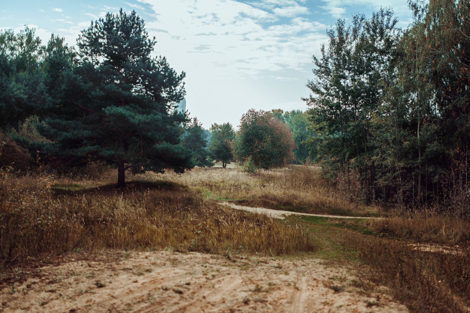 Exuberante pino en un camino de arena en el bosqueExuberante pino en un camino de arena en el bosque