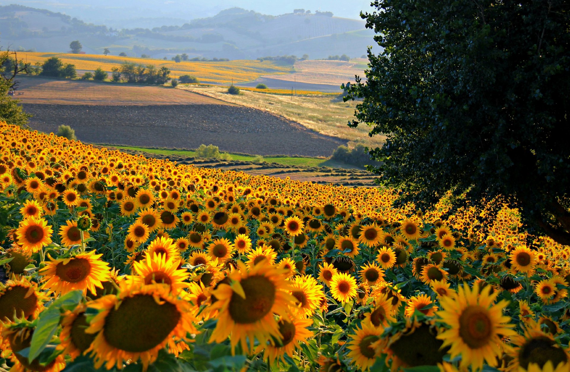 Dibujos animados brillantes y soleados con colinas y claros de floresDibujos animados brillantes y soleados con colinas y claros de flores