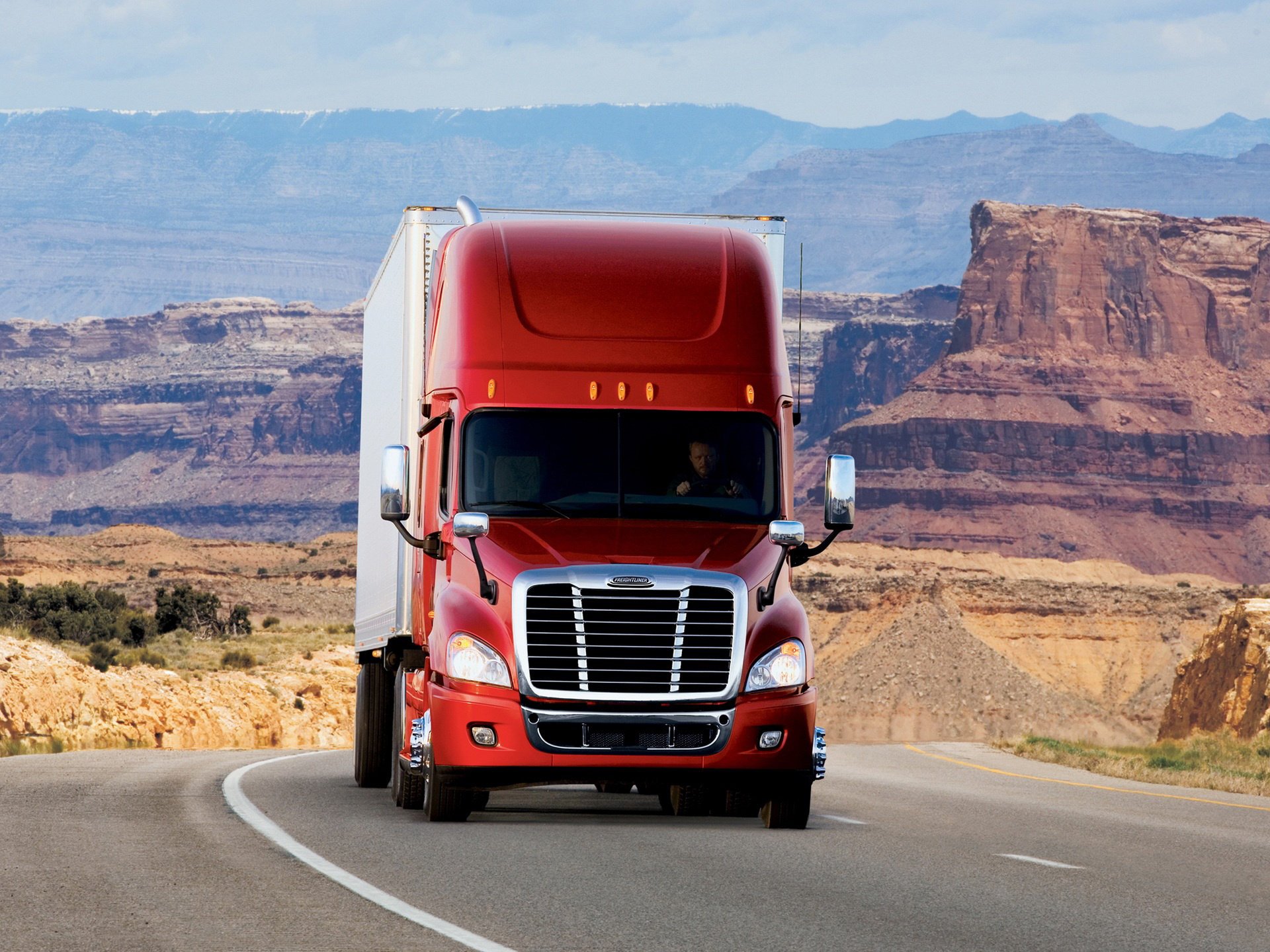 Camión en la carretera en el fondo de las montañas