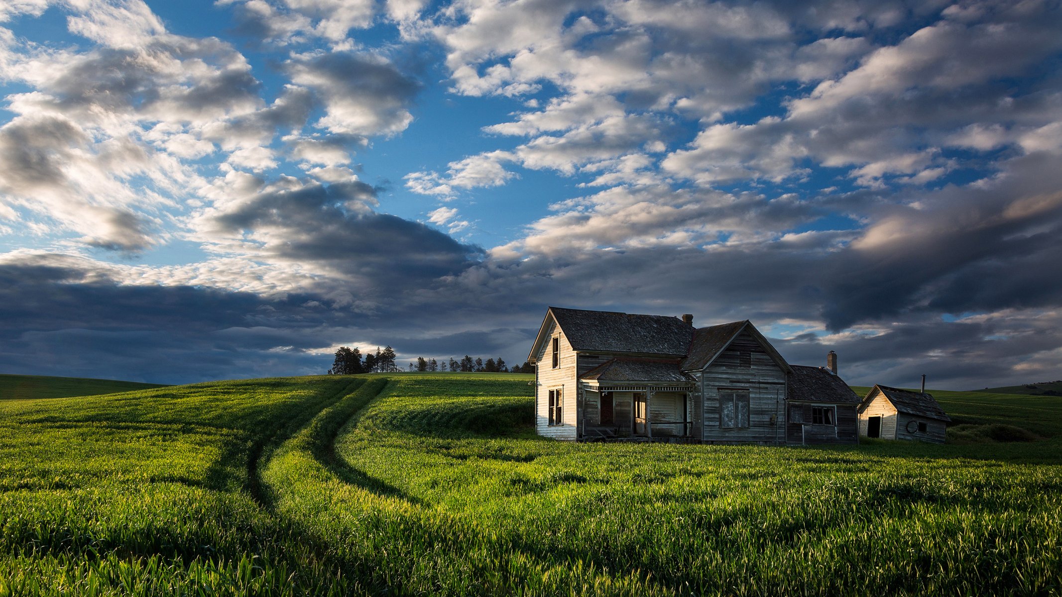 Hermosa vista del campo con casas. cielo con nubes exuberantesHermosa vista del campo con casas. Cielo con nubes exuberantes