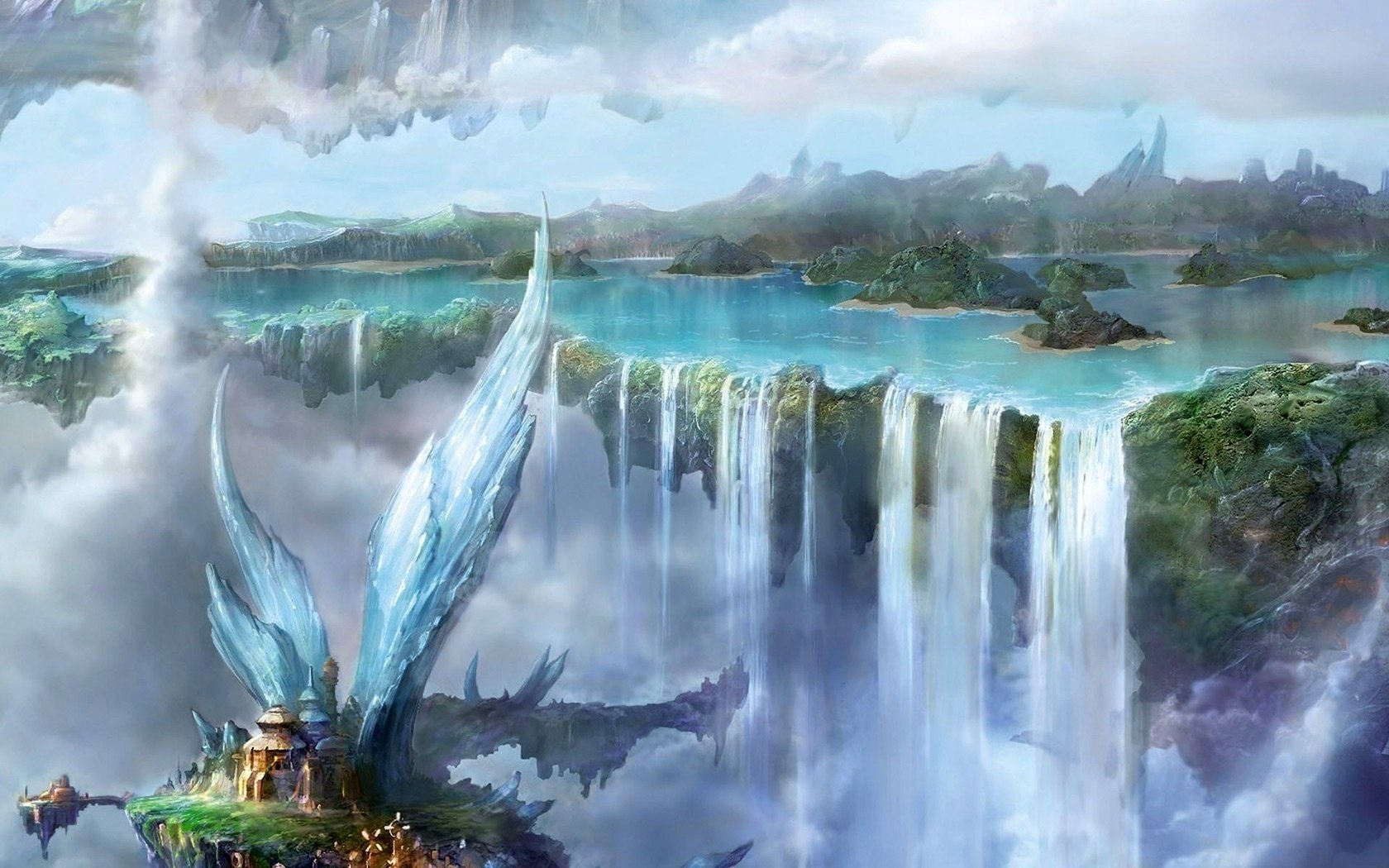 Un hombre con una camiseta en una isla con una cascadaUn hombre con una camiseta en una isla con una cascada