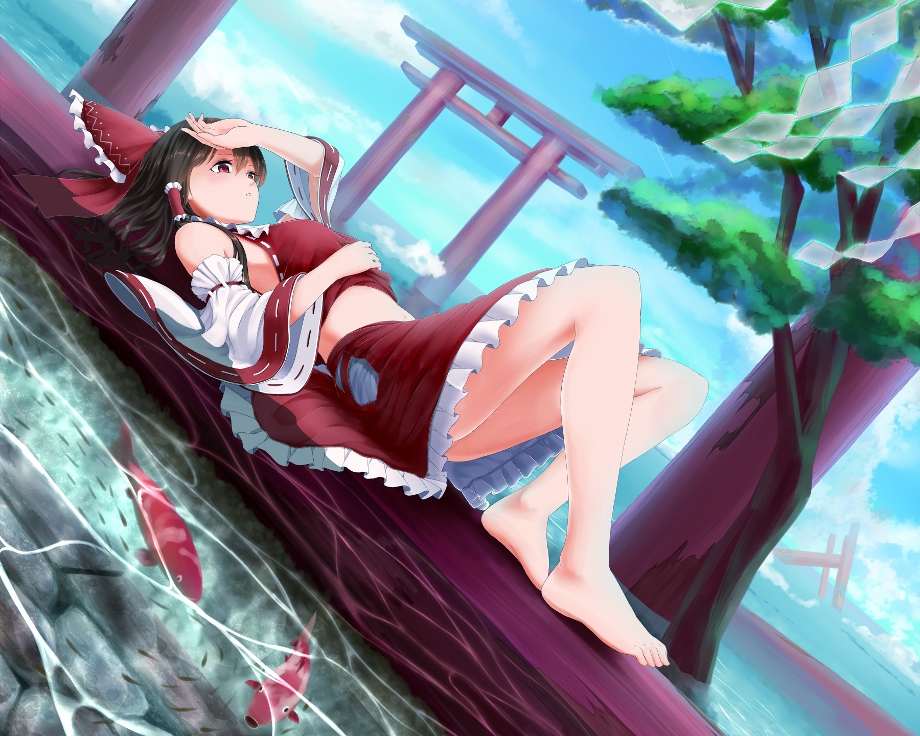 Figura de anime. chica de rojo tendida cerca de un estanqueFigura de anime. Chica de rojo tendida cerca de un estanque