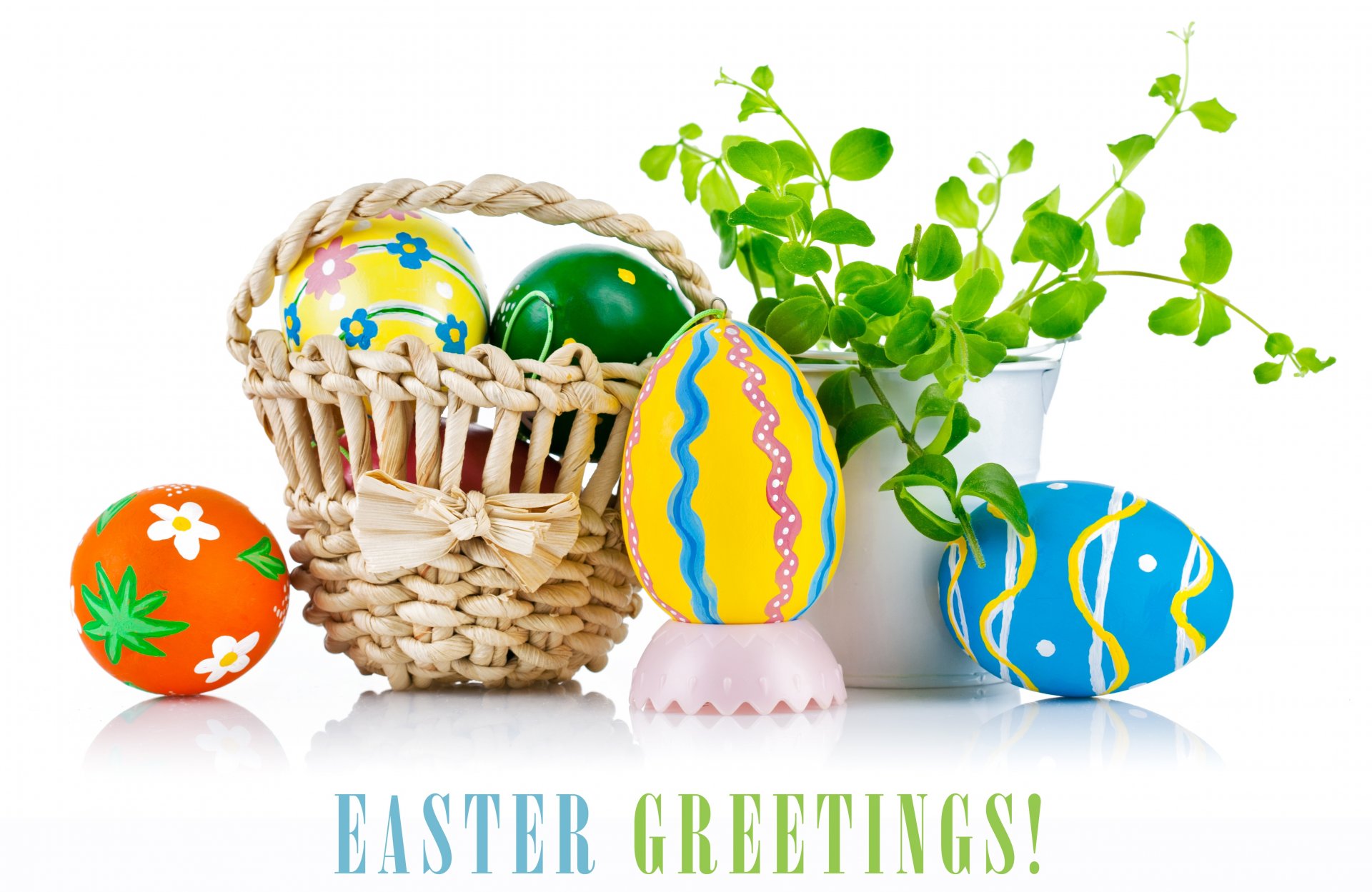 Tarjeta de pascua. cesta de tulipanes y huevos de codornizTarjeta de Pascua. Cesta de tulipanes y huevos de codorniz