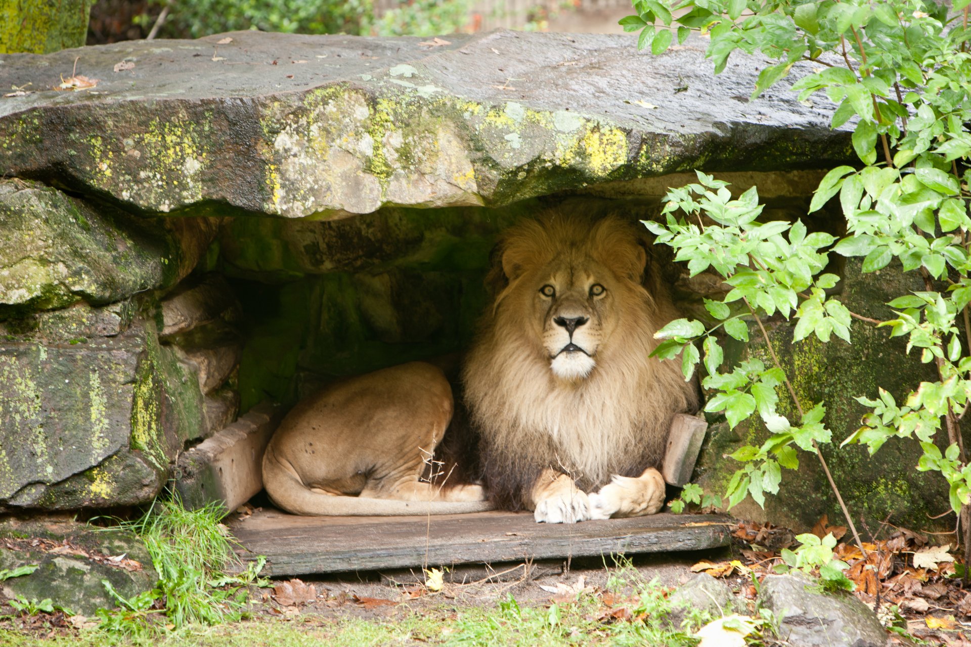 Un león con una melena de lujo yace debajo de una roca en una cuevaUn León con una melena de lujo yace debajo de una roca en una cueva