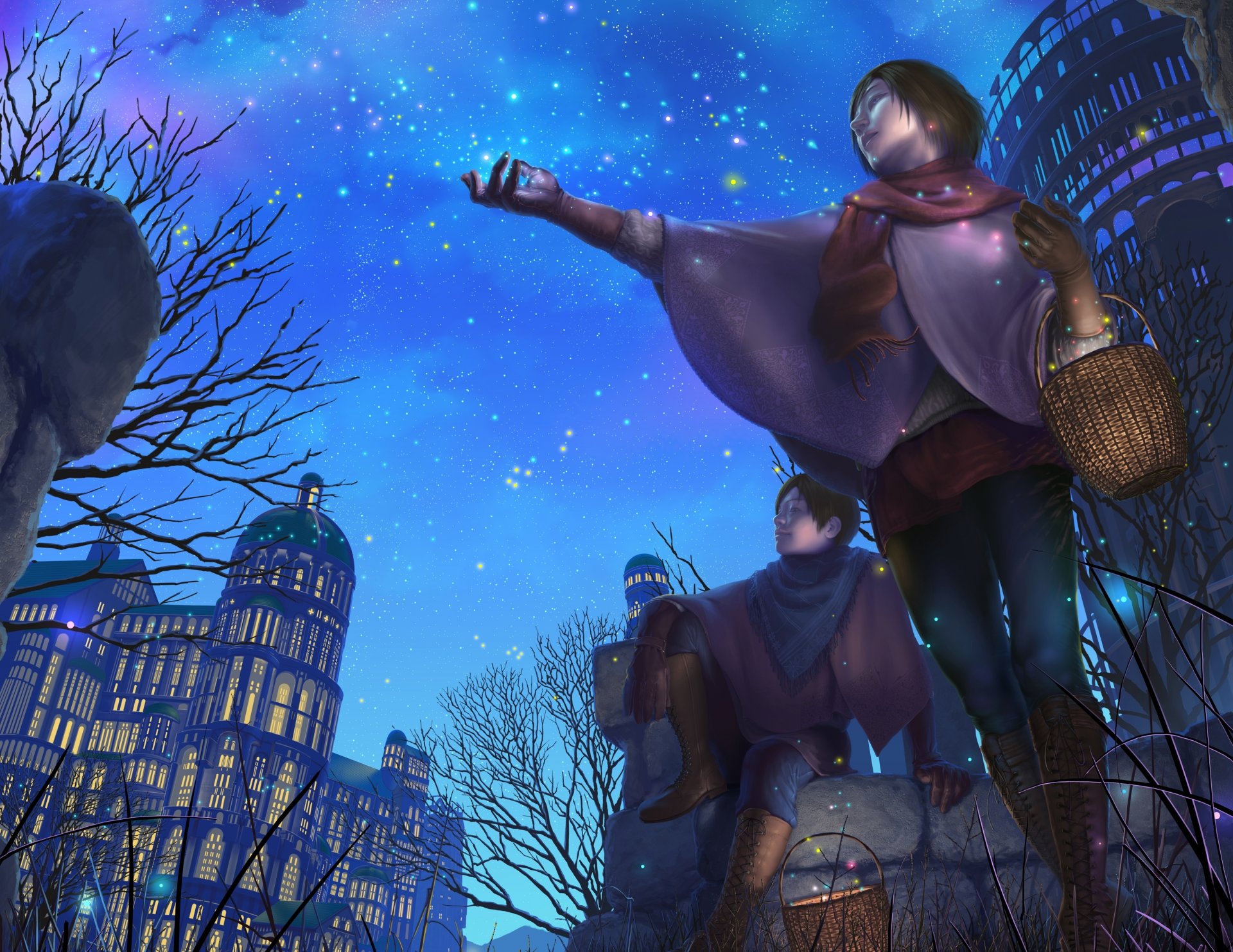 Chica y chico bajo el cielo nocturno y las estrellasChica y chico bajo el cielo nocturno y las estrellas